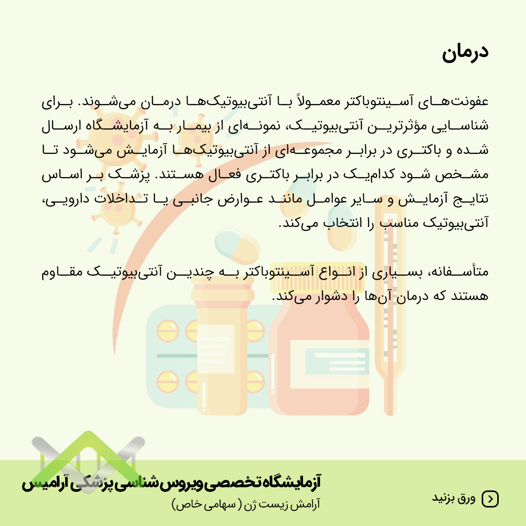 متأسفانه بسیاری از انواع آسینتوباکتر به چندین آنتی بیوتیک مقاوم هستند که درمان آنها را دشوار میکند.