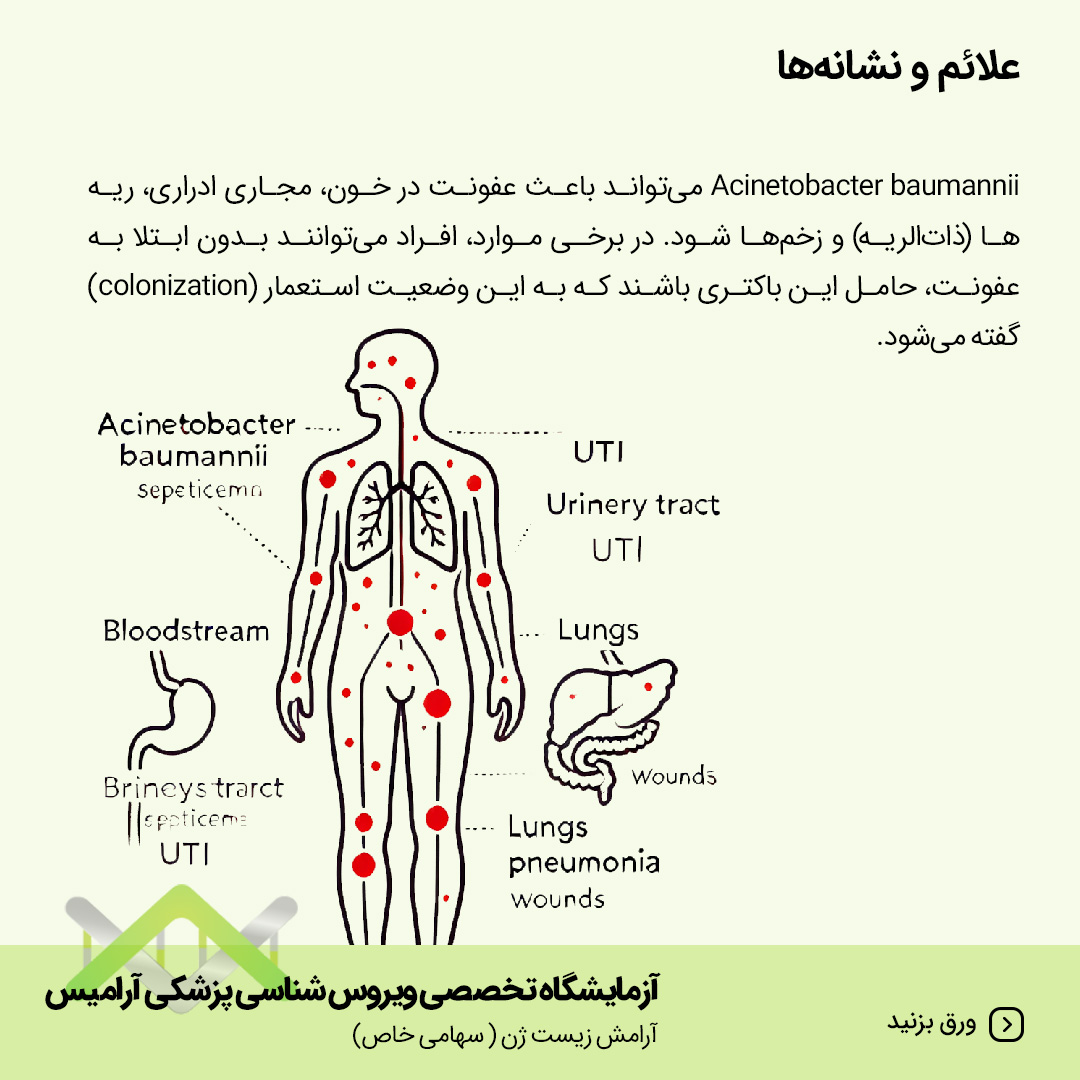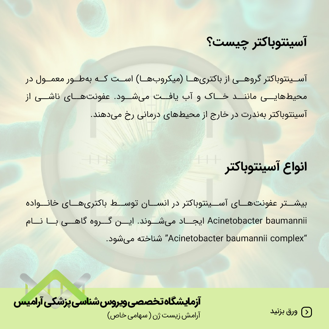 آسینتوباکتر گروهی از باکتری ها (میکروب ها) است که به طور معمول در محیط هایی مانند خاک و آب یافت میشود. عفونت های ناشی از آسینتوباکتر به ندرت در خارج از محیط های درمانی رخ می دهند.