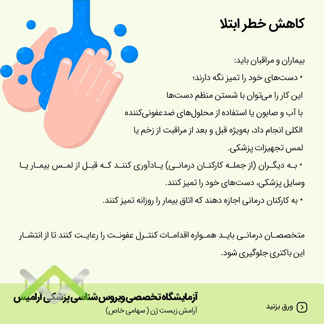 متخصصان درمانی باید همواره اقدامات کنترل عفونت را رعایت کنند تا از انتشار این باکتری جلوگیری شود.
