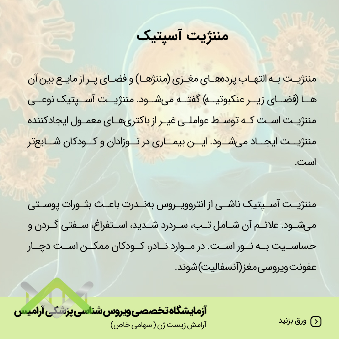 مننژیت به التهاب پرده های مغزی (مننژها) و فضای پر از مایع بین آن ها فضای زیر عنکبوتیه گفته میشود. مننژیت آسپتیک نوعی مننژیت است که توسط عواملی غیر از باکتری های معمول ایجاد کننده مننژیت ایجاد میشود این بیماری در نوزادان و کودکان شایع تر است.