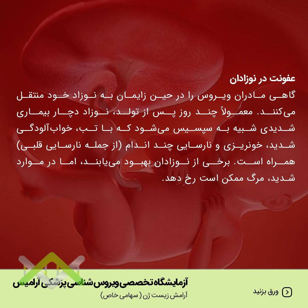 گاهی مادران ویروس را در حین زایمان به نوزاد خود منتقل می کنند. معمولاً چند روز پس از تولد نوزاد دچار بیماری شدیدی شبیه به سپسیس می شود که با تب، خواب آلودگی شدید، خونریزی و نارسایی چند اندام از جمله نارسایی قلبی همراه است. برخی از نوزادان بهبود می یابند اما در موارد شدید مرگ ممکن است رخ دهد.