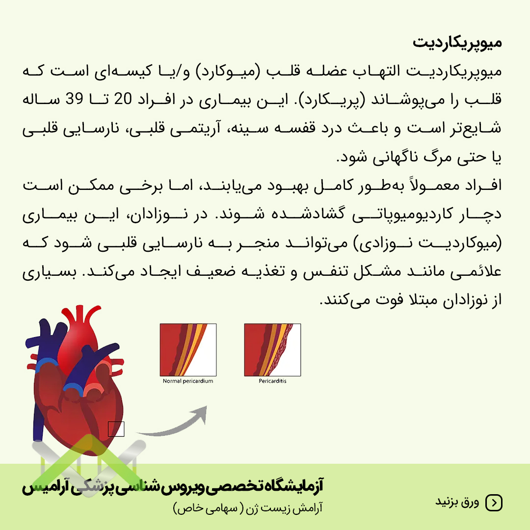 میوپریکاردیت التهاب عضله قلب (میوکارد) و یا کیسه ای است که قلب را میپوشاند(پریکارد). این بیماری در افراد 20 تا 39 ساله شایع تر است و باعث درد قفسه سینه، آریتمی قلبی، نارسایی قلبی یا حتی مرگ ناگهانی شود.