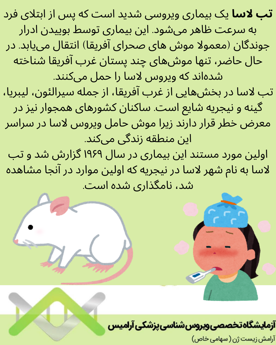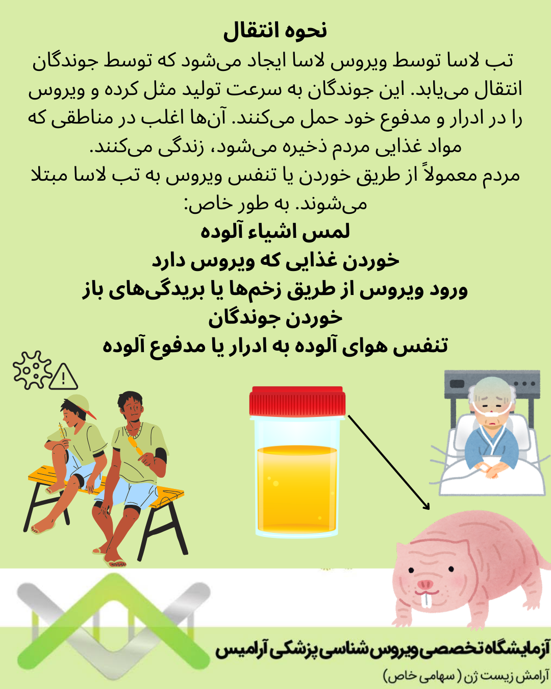 تب لاسا یک بیماری ویروسی شدید است که پس از ابتلای فرد به سرعت ظاهر میشود. این بیماری توسط بوییدن ادرار (جوندگان معمولا) موش های صحرای آفریقا انتقال می یابد. در حال حاضر تنها موش های چند پستان غرب آفریقا شناخته شده اند که ویروس لاسا را حمل میکنند.
