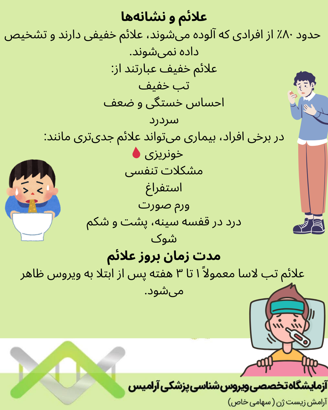 علائم تب لاسا معمولاً ۱ تا ۳ هفته پس از ابتلا به ویروس ظاهر می شود.