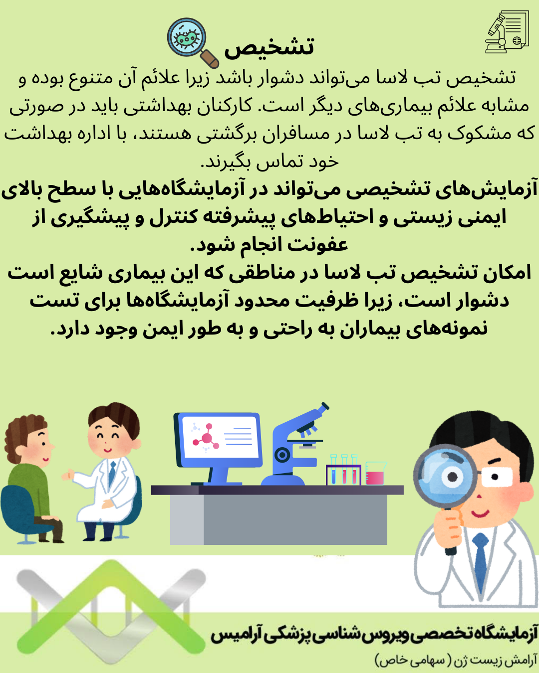 آزمایش های تشخیصی میتواند در آزمایشگاه هایی با سطح بالای ایمنی زیستی و احتیاط های پیشرفته کنترل و پیشگیری از عفونت انجام شود.