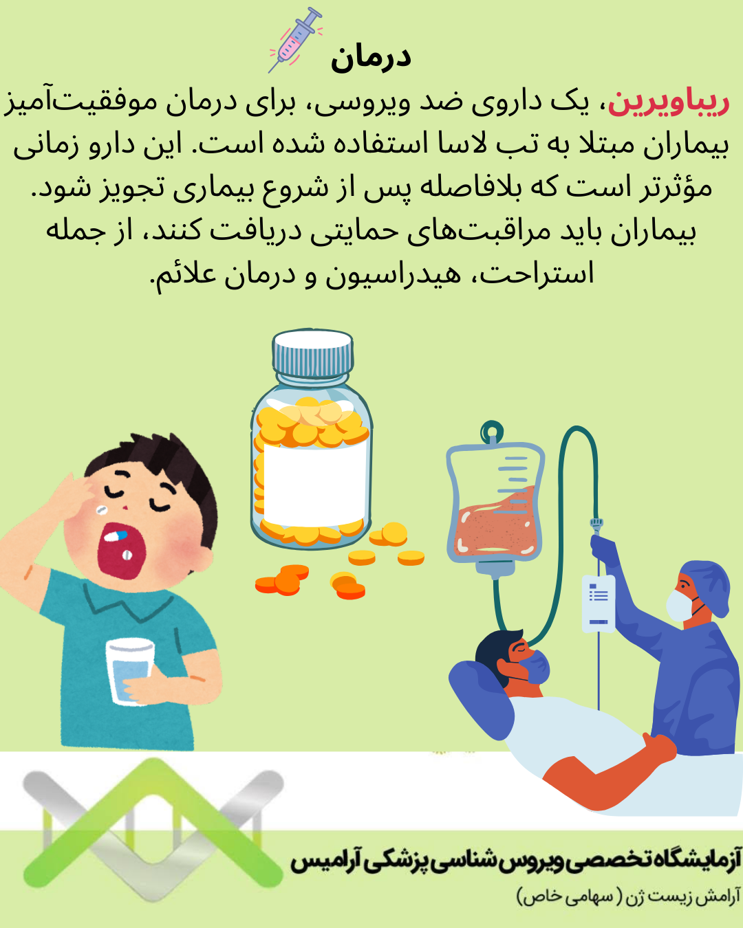 ریباویرین یک داروی ضد ویروسی برای درمان موفقیت آمیز بیماران مبتلا به تب لاسا استفاده شده است. این دارو زمانی مؤثرتر است که بلافاصله پس از شروع بیماری تجویز شود. بیماران باید مراقبت های حمایتی دریافت کنند از جمله استراحت هیدراسیون و درمان علائم.
