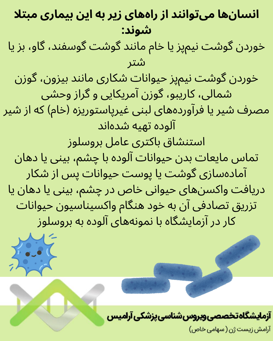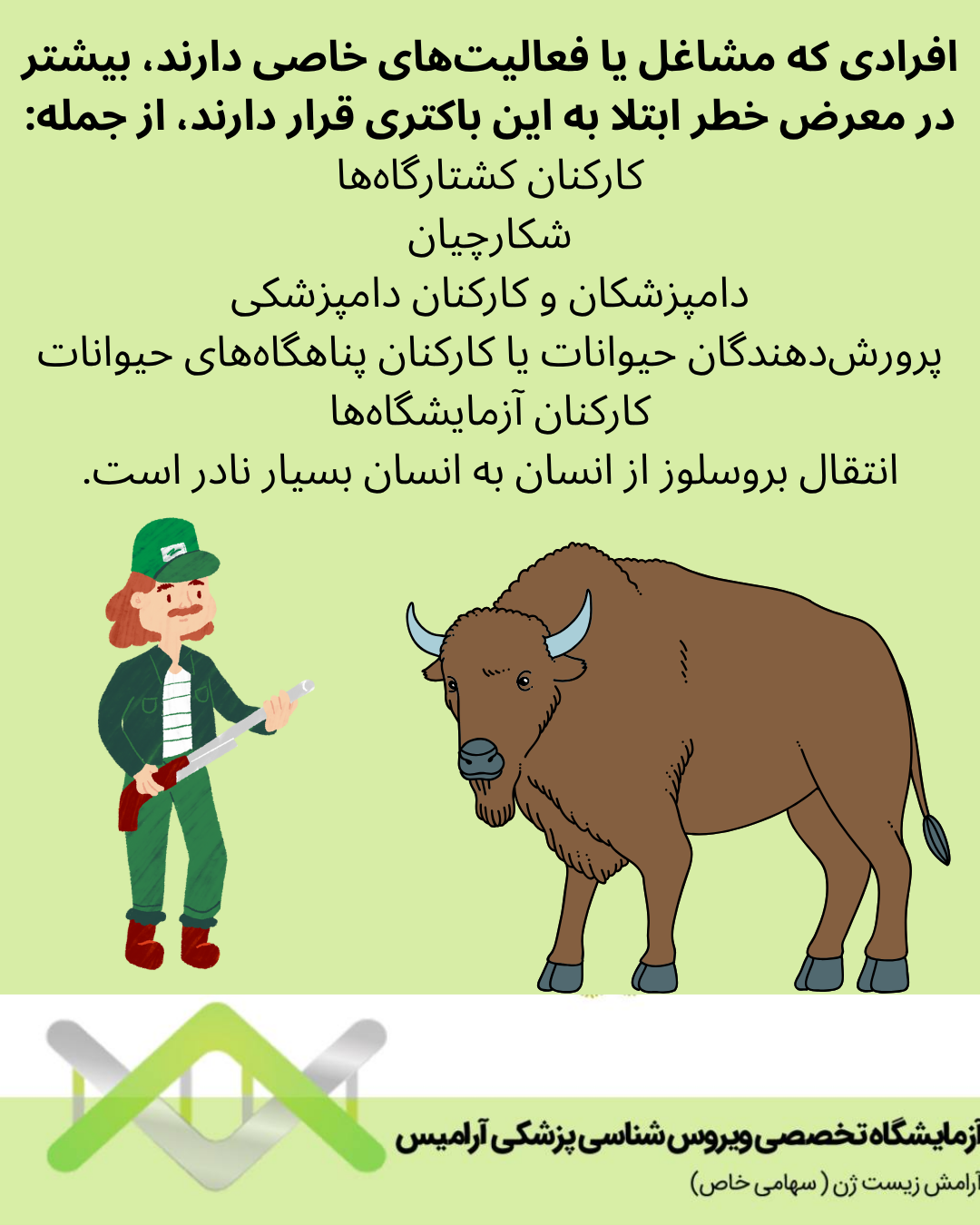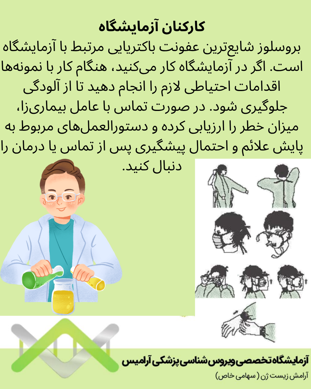 بروسلوز شایع ترین عفونت باکتریایی مرتبط با آزمایشگاه است. اگر در آزمایشگاه کار میکنید هنگام کار با نمونه ها اقدامات احتیاطی لازم را انجام دهید تا از آلودگی جلوگیری شود. در صورت تماس با عامل بیماریزا میزان خطر را ارزیابی کرده و دستورالعمل های مربوط به پایش علائم و احتمال پیشگیری پس از تماس یا درمان را دنبال کنید.