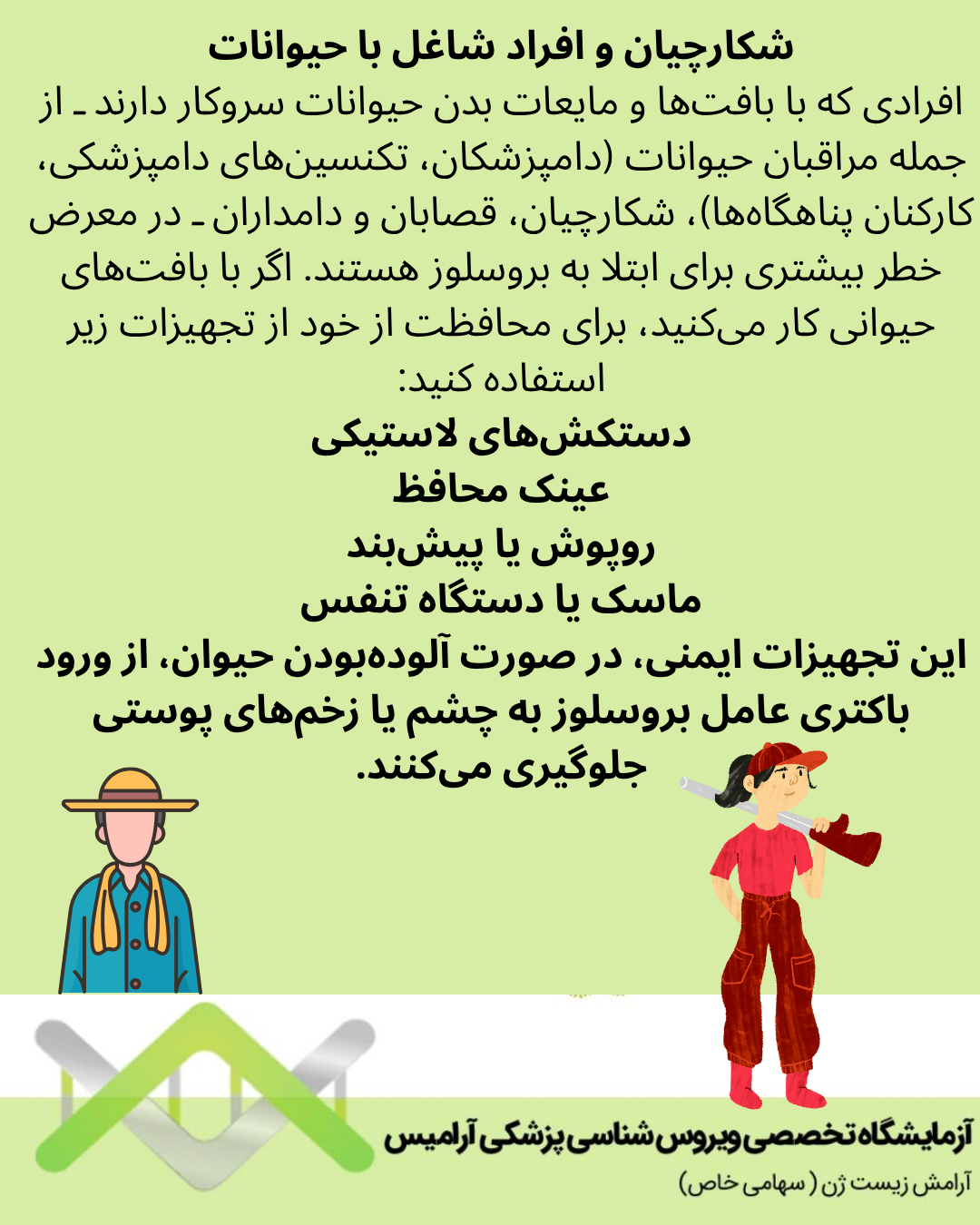 افرادی که با بافت ها و مایعات بدن حیوانات سروکار دارند – از جمله مراقبان حیوانات (دامپزشکان، تکنسین های دامپزشکی، کارکنان پناهگاه ها) شکارچیان، قصابان و دامداران – در معرض خطر بیشتری برای ابتلا به بروسلوز هستند. اگر با بافت های حیوانی کار میکنید برای محافظت از خود از تجهیزات زیر استفاده کنید: