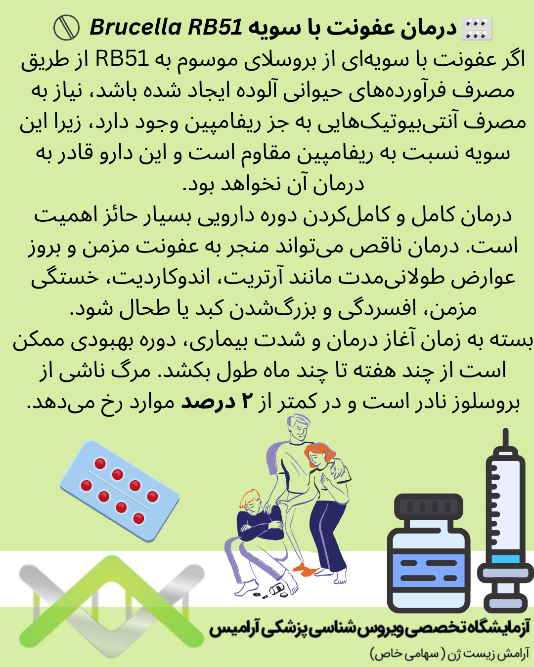 اگر عفونت با سویه ای از بروسلای موسوم به RB51 از طریق مصرف فرآورده های حیوانی آلوده ایجاد شده باشد، نیاز به مصرف آنتی بیوتیک هایی به جز ریفامپین وجود دارد زیرا این سویه نسبت به ریفامپین مقاوم است و این دارو قادر به درمان آن نخواهد بود.