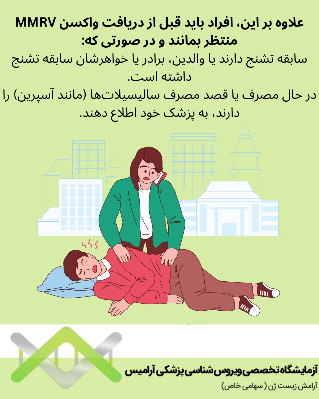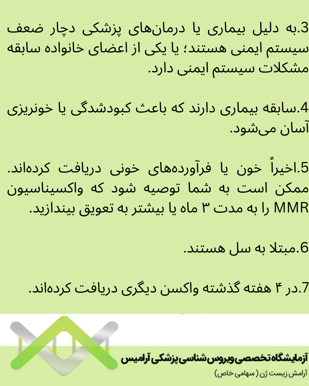• اخیراً خون یا فرآوردههای خونی دریافت کردهاند. ممکن است به شما توصیه شود که واکسیناسیون MMR را به مدت ۳ ماه یا بیشتر به تعویق بیندازید.