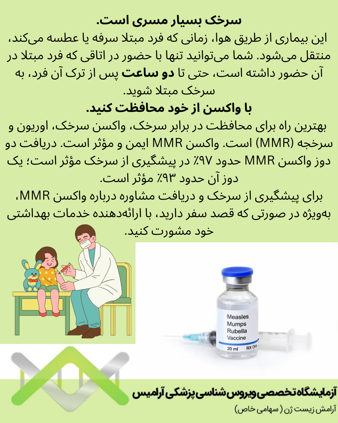 برای پیشگیری از سرخک و دریافت مشاوره درباره واکسن MMR، بهویژه در صورتی که قصد سفر دارید، با ارائهدهنده خدمات بهداشتی خود مشورت کنید