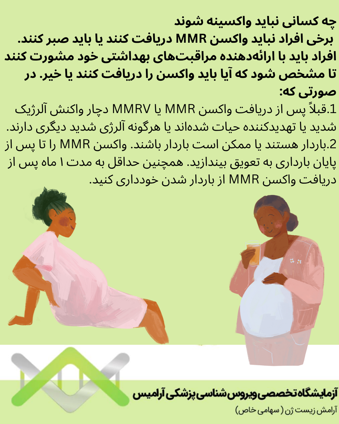 • اخیراً خون یا فرآوردههای خونی دریافت کردهاند. ممکن است به شما توصیه شود که واکسیناسیون MMR را به مدت ۳ ماه یا بیشتر به تعویق بیندازید.