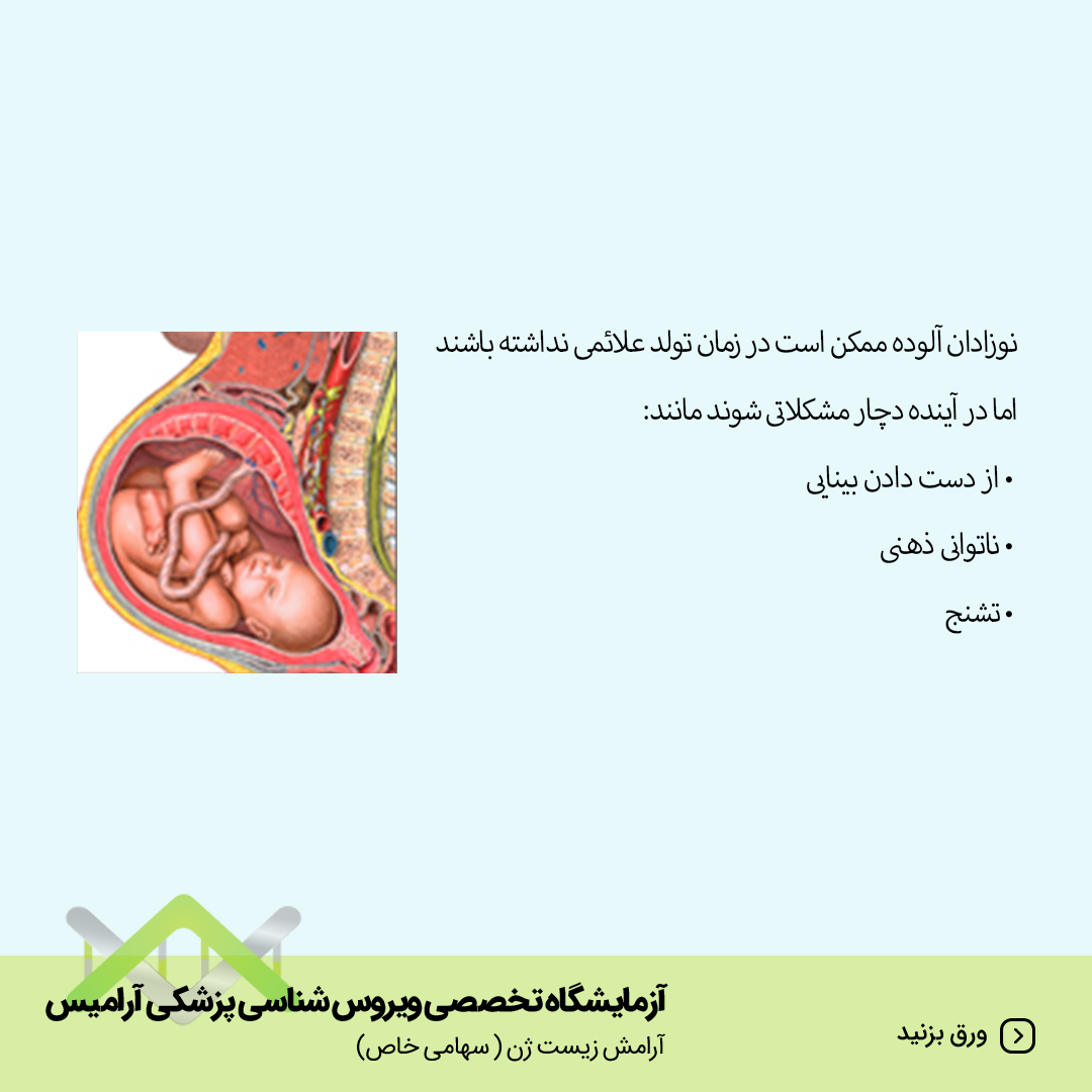 نوزادان آلوده ممکن است در زمان تولد علائمی نداشته باشند اما در آینده دچار مشکلاتی شوند مانند: