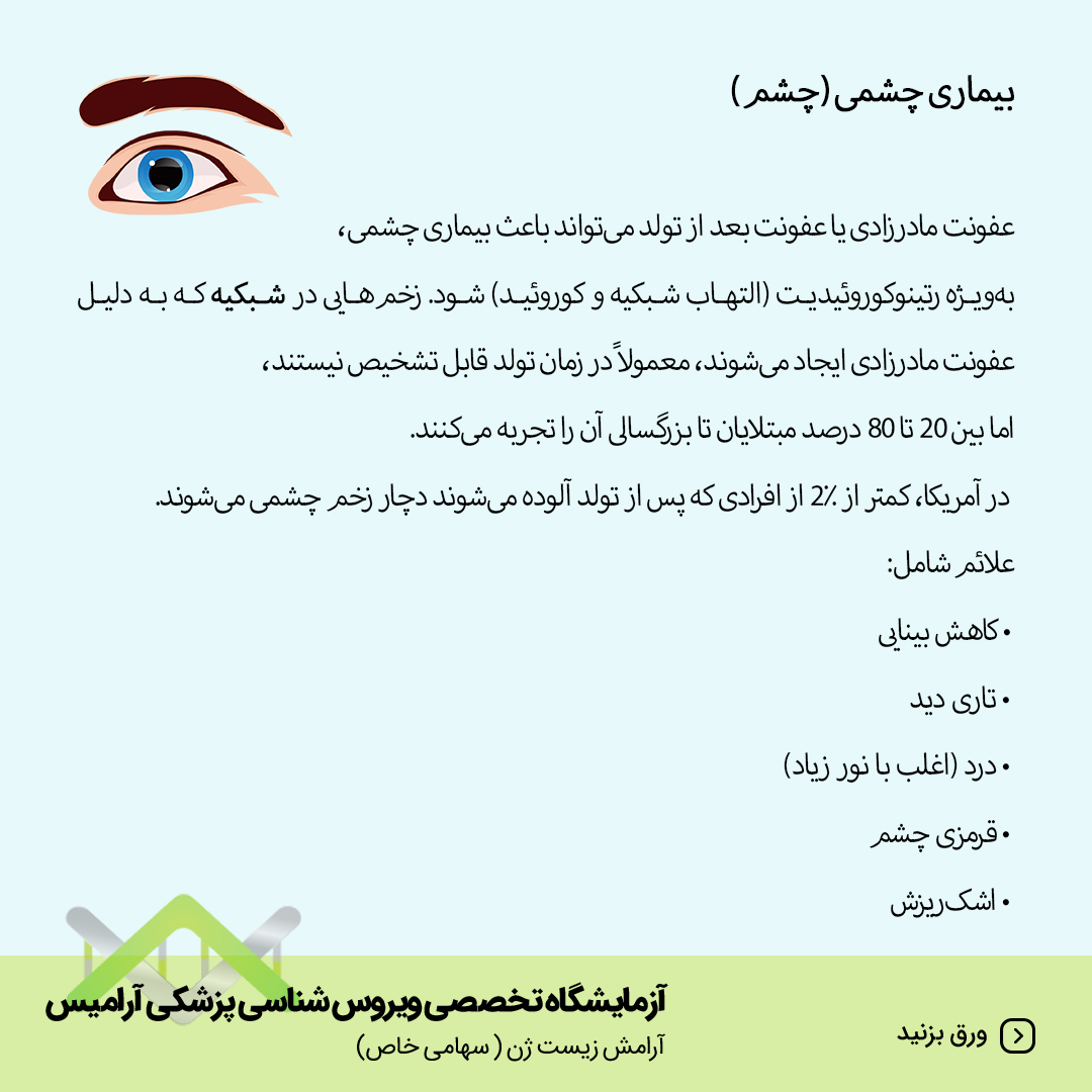 عفونت مادرزادی یا عفونت بعد از تولد میتواند باعث بیماری چشمی، به ویژه رتینوکوروئیدیت (التهاب شبکیه و کوروئید) شود. زخم هایی در شبکیه که به دلیل عفونت مادرزادی ایجاد میشوند معمولاً در زمان تولد قابل تشخیص نیستند.