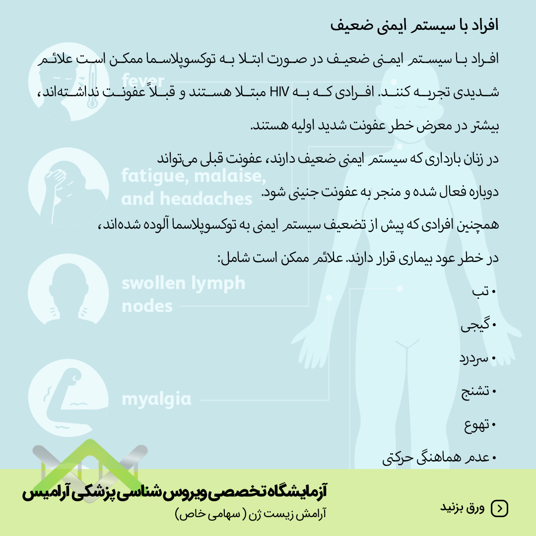 افراد با سیستم ایمنی ضعیف در صورت ابتلا به توکسوپلاسما ممکن است علائم شدیدی تجربه کنند افرادی که به HIV مبتلا هستند و قبلاً عفونت نداشته اند بیشتر در معرض خطر عفونت شدید اولیه هستند.