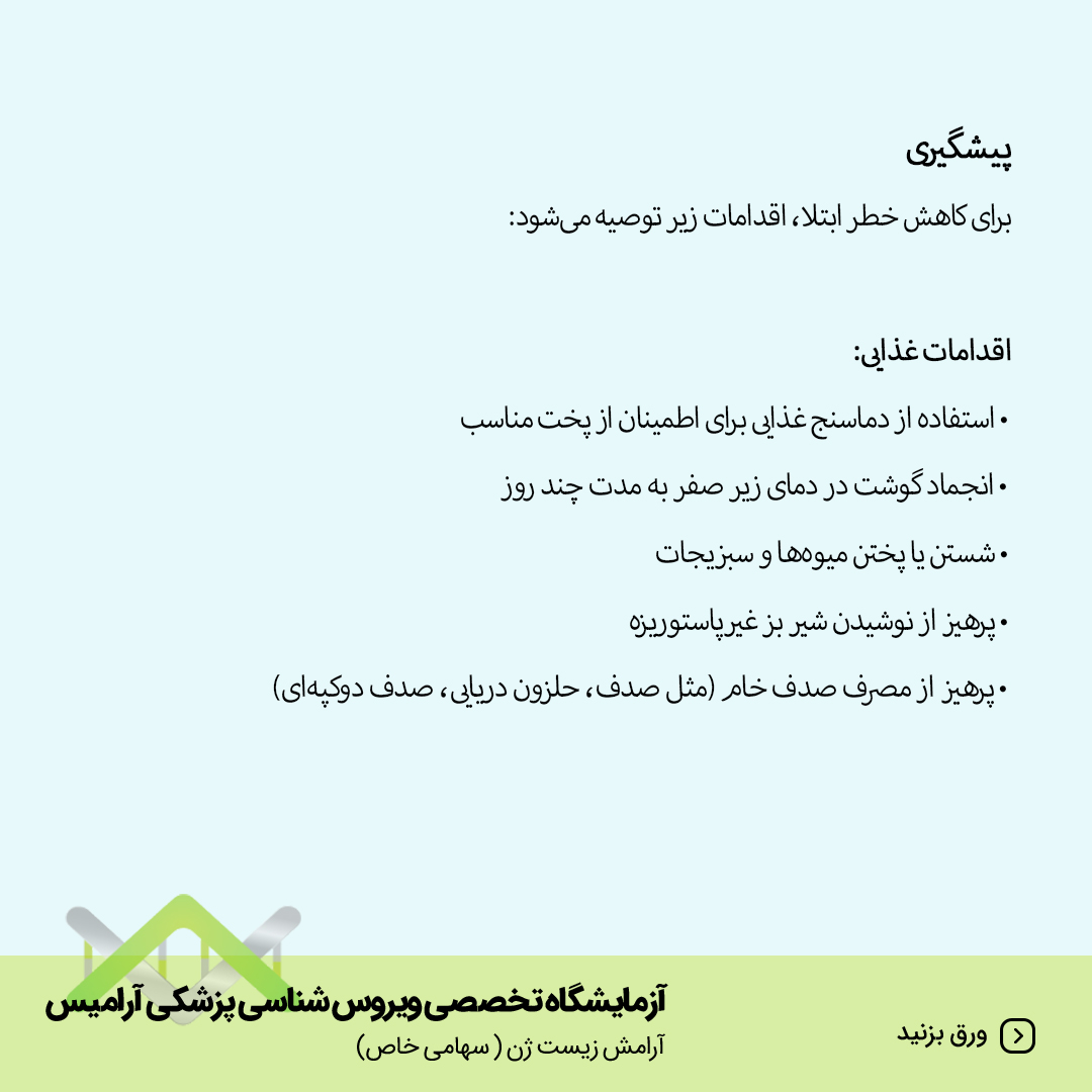 - انتقال غذایی: مصرف گوشت یا صدف نیم پز آلوده، یا میوه و سبزیجات شسته نشده.