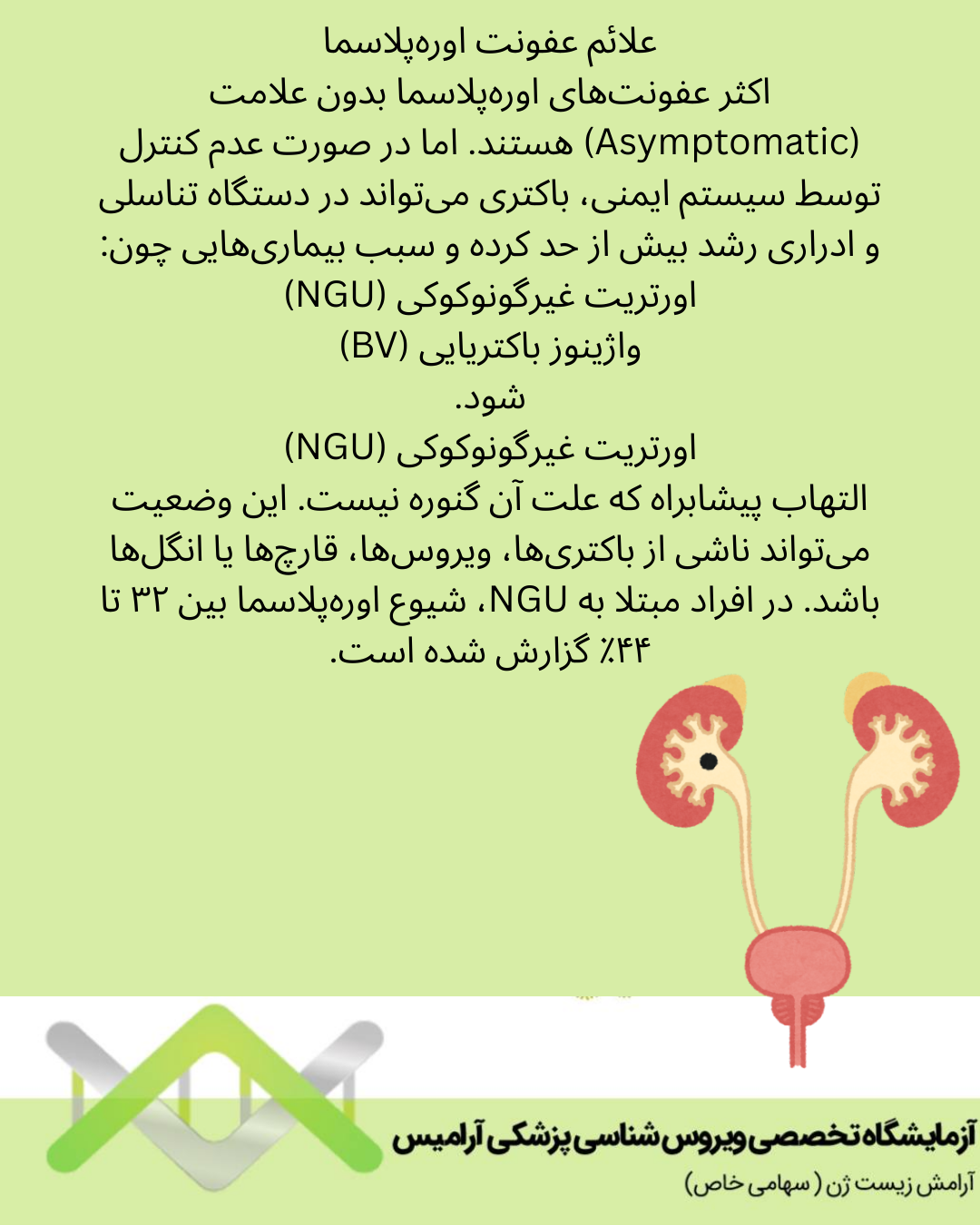 اکثر عفونت های اوره پلاسما بدون علامت (Asymptomatic) هستند. اما در صورت عدم کنترل توسط سیستم ایمنی باکتری میتواند در دستگاه تناسلی و ادراری رشد بیش از حد کرده و سبب بیماری هایی چون: