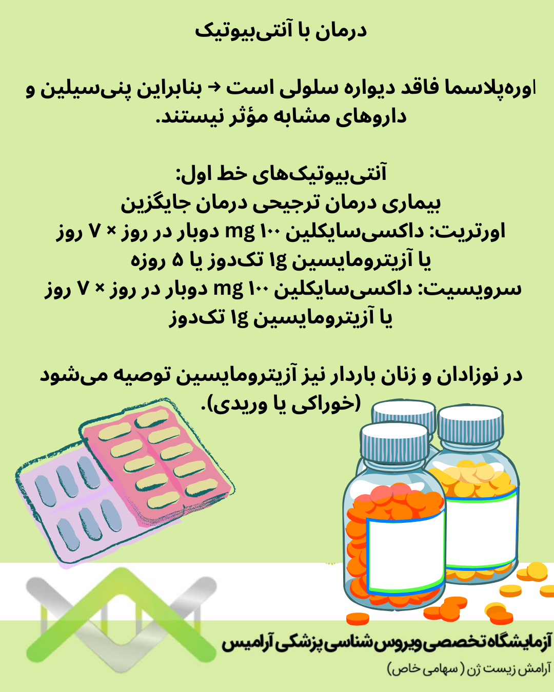 اورتریت: داکسی سایکلین ۱۰۰ mg دوبار در روز × ۷ روز یا آزیترومایسین 1g تک دوز یا ۵ روزه