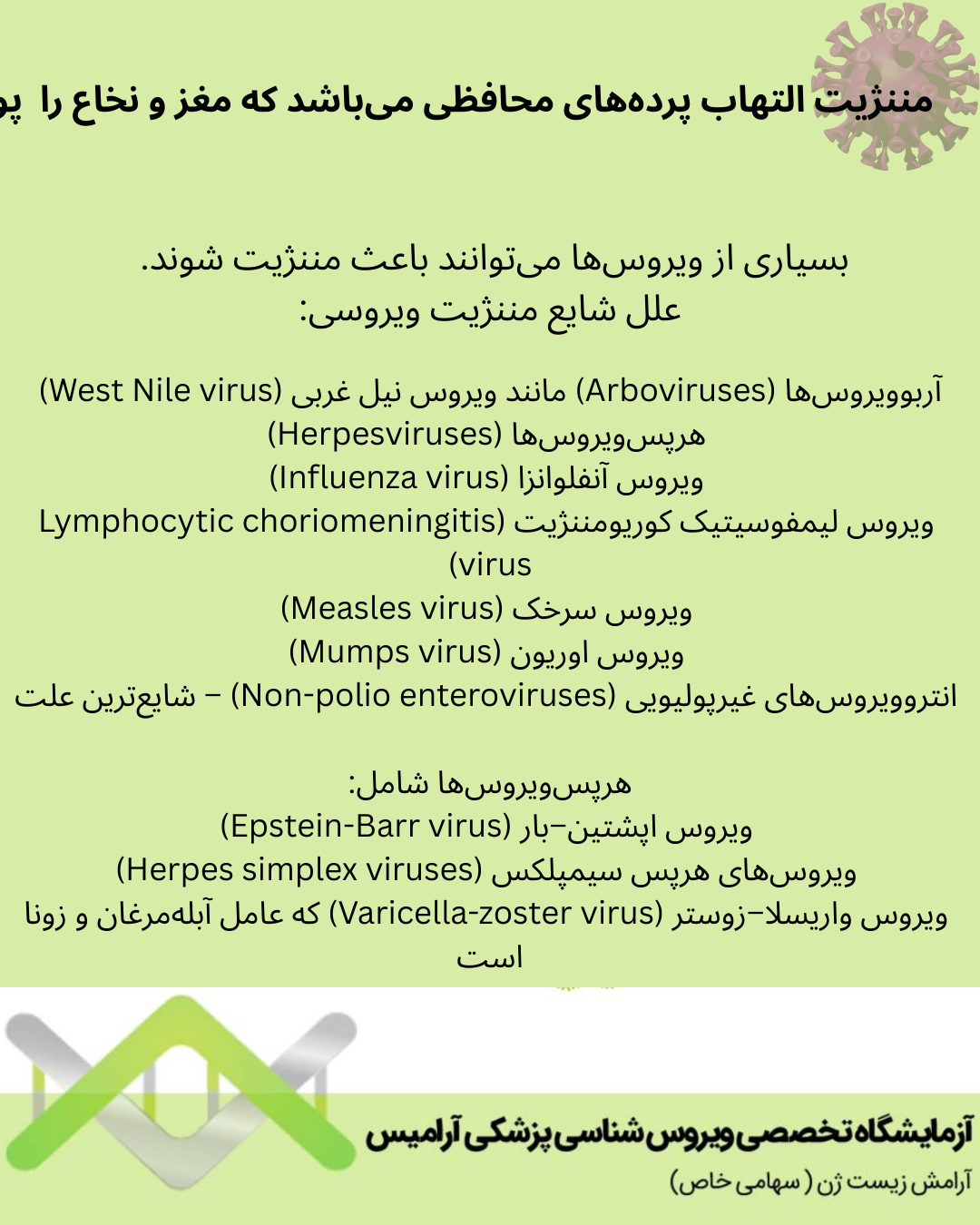 • ویروس واریسلا–زوستر (Varicella-zoster virus) که عامل آبلهمرغان و زونا است