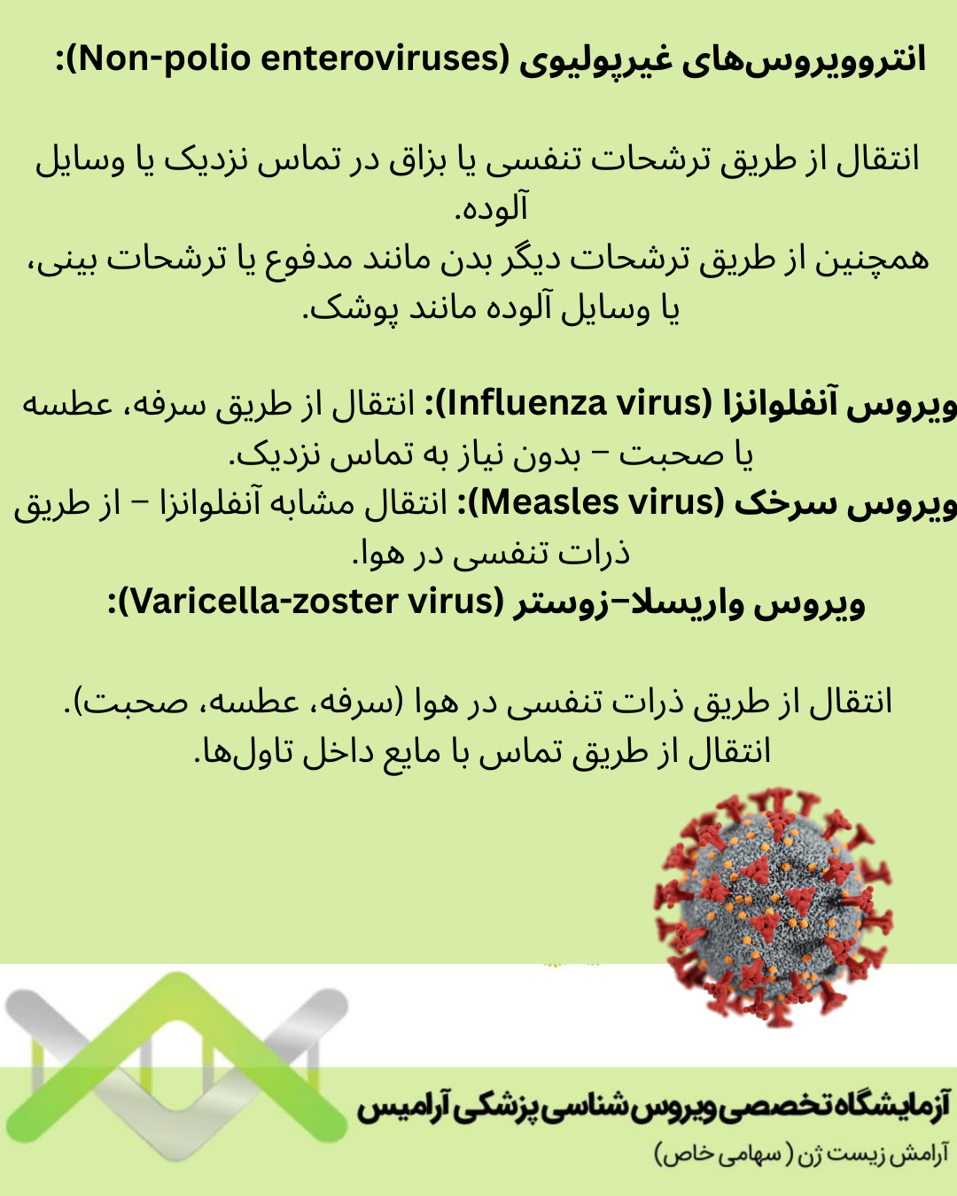 * ویروس سرخک (Measles virus): انتقال مشابه آنفلوانزا – از طریق ذرات تنفسی در هوا.