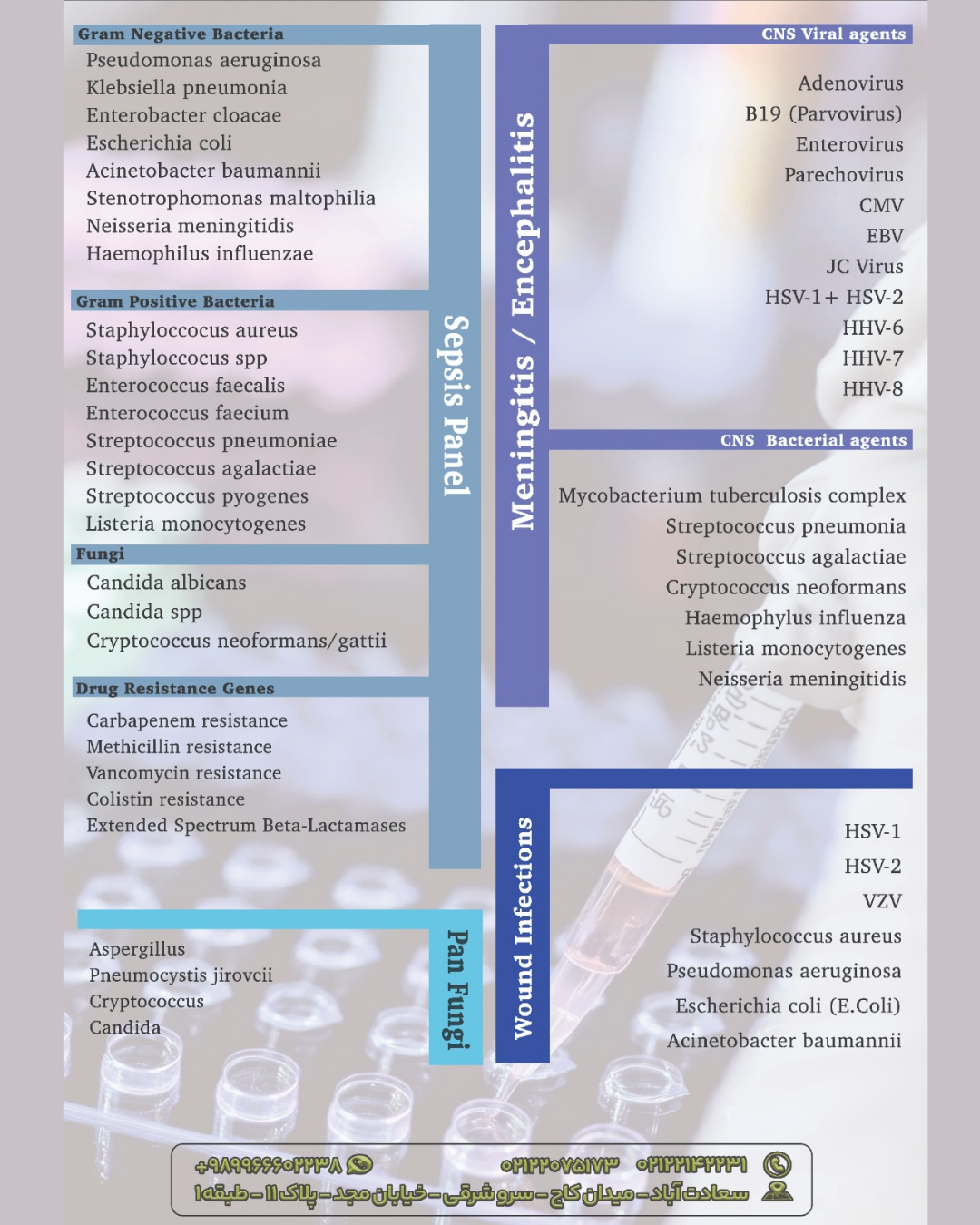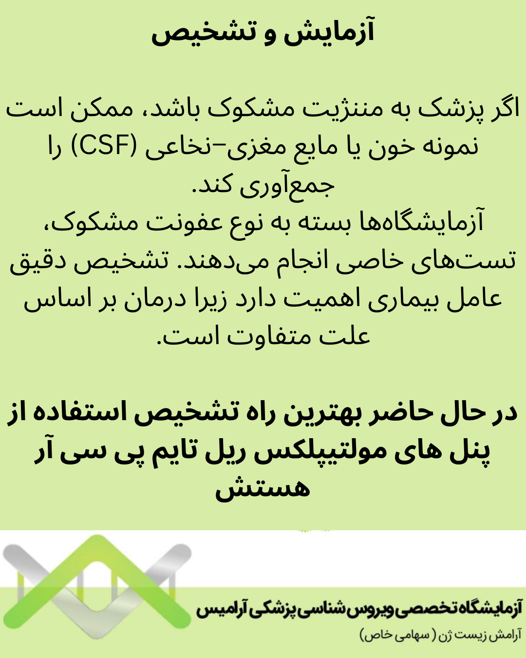 آزمایشگاهها بسته به نوع عفونت مشکوک، تستهای خاصی انجام میدهند. تشخیص دقیق عامل بیماری اهمیت دارد زیرا درمان بر اساس علت متفاوت است.