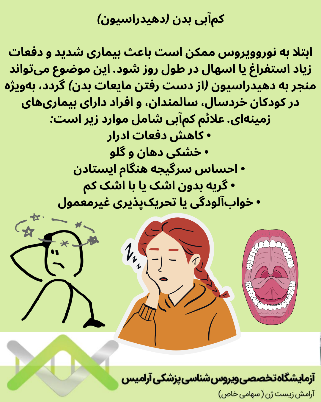 ابتلا به نوروویروس ممکن است باعث بیماری شدید و دفعات زیاد استفراغ یا اسهال در طول روز شود. این موضوع میتواند منجر به دهیدراسیون (از دست رفتن مایعات بدن) گردد، بهویژه در کودکان خردسال، سالمندان، و افراد دارای بیماریهای زمینهای. علائم کمآبی شامل موارد زیر است: