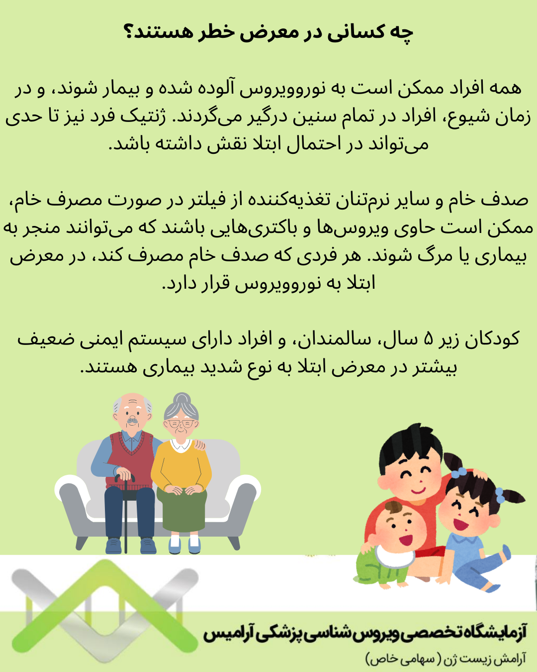 همه افراد ممکن است به نوروویروس آلوده شده و بیمار شوند، و در زمان شیوع، افراد در تمام سنین درگیر میگردند. ژنتیک فرد نیز تا حدی میتواند در احتمال ابتلا نقش داشته باشد.