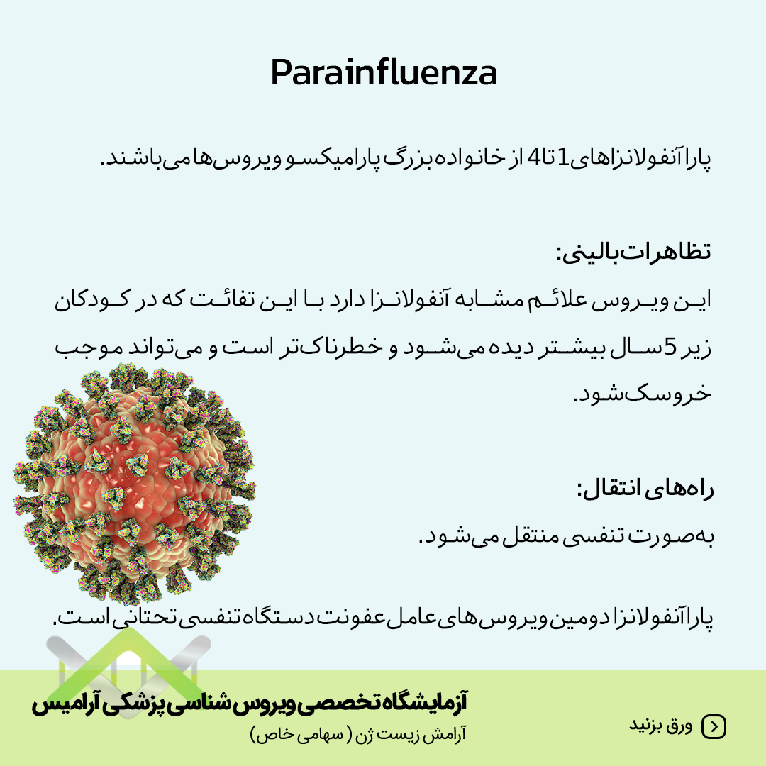 راههای انتقال : به صورت تنفسی منتقل می شود. پارا آنفولانزا دومین ویروس های عامل عفونت دستگاه تنفسی تحتانی است.