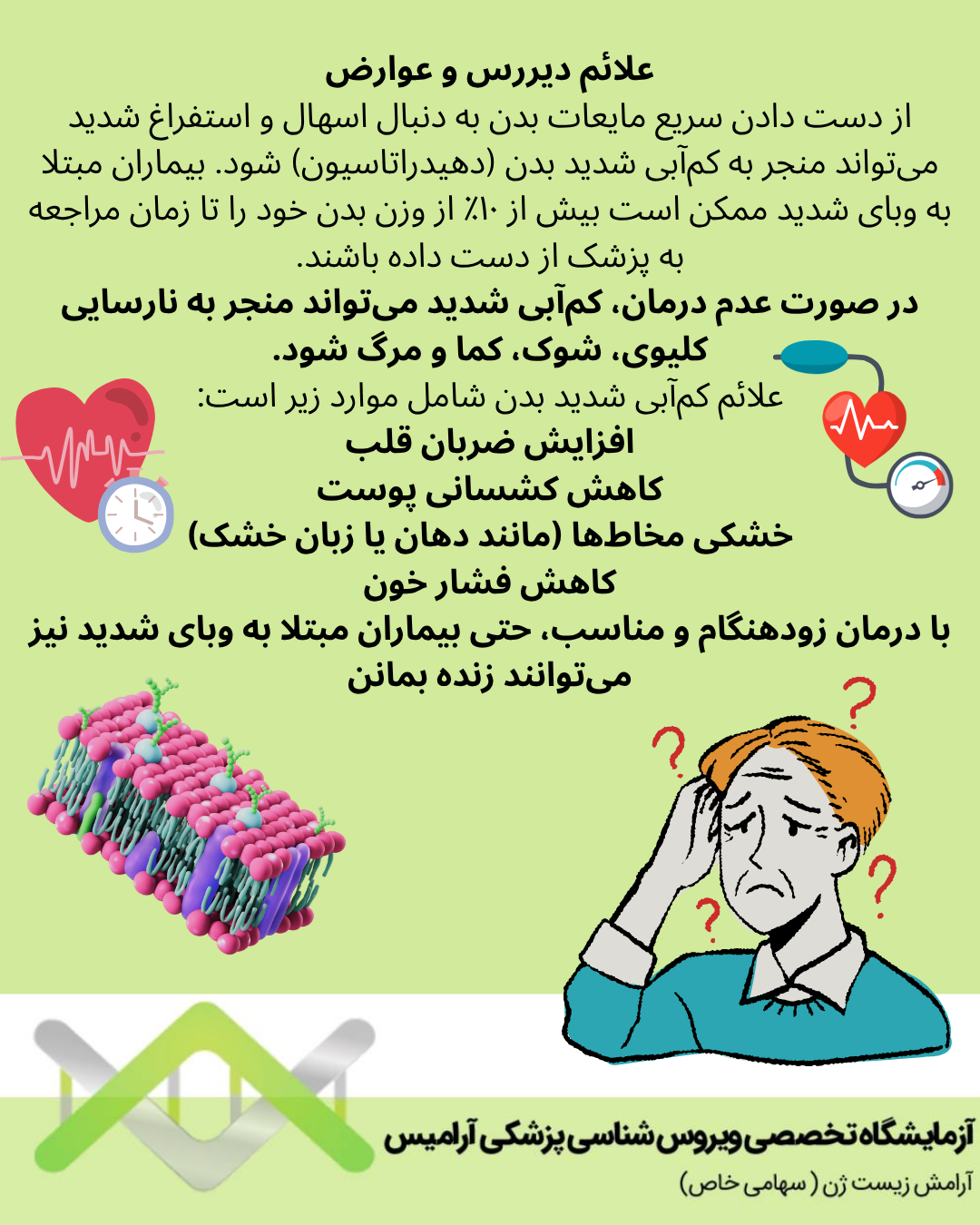 • اسهال آبکی (که گاهی با عنوان “مدفوع برنجی” توصیف میشود، چراکه ظاهری شیری-سفید دارد)