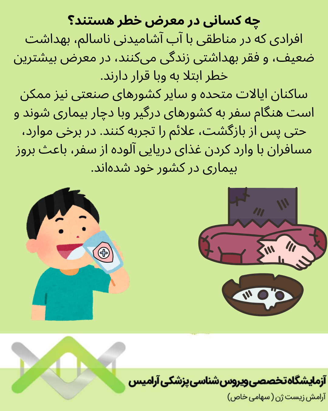افرادی که در مناطقی با آب آشامیدنی ناسالم، بهداشت ضعیف، و فقر بهداشتی زندگی میکنند، در معرض بیشترین خطر ابتلا به وبا قرار دارند.