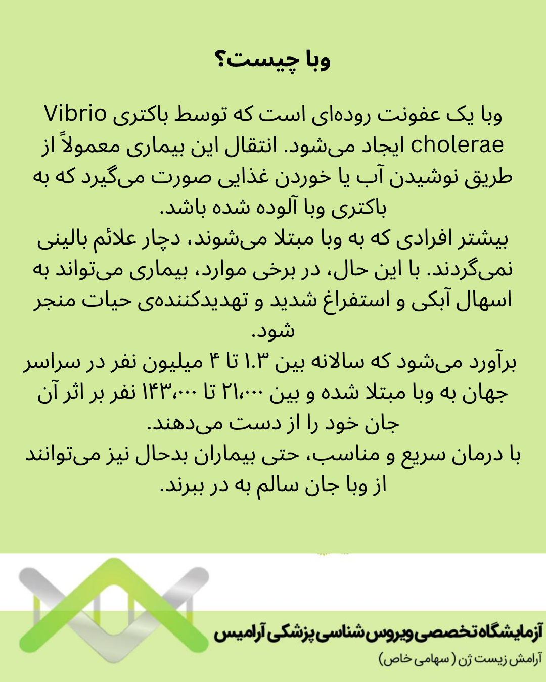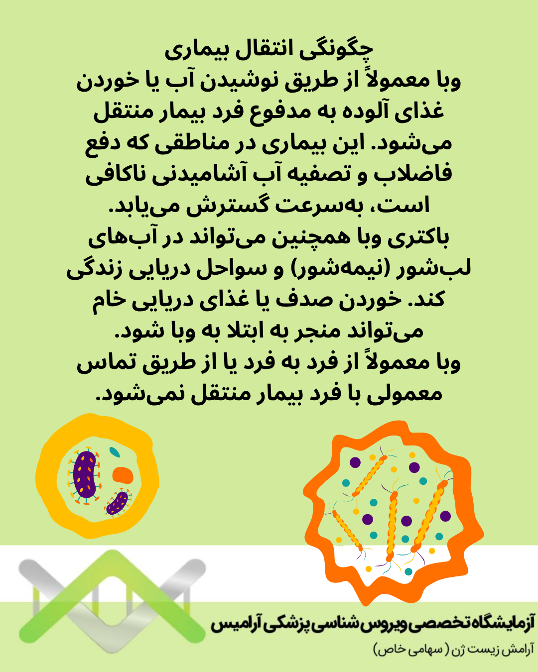 وبا یک عفونت رودهای است که توسط باکتری Vibrio cholerae ایجاد میشود. انتقال این بیماری معمولاً از طریق نوشیدن آب یا خوردن غذایی صورت میگیرد که به باکتری وبا آلوده شده باشد.