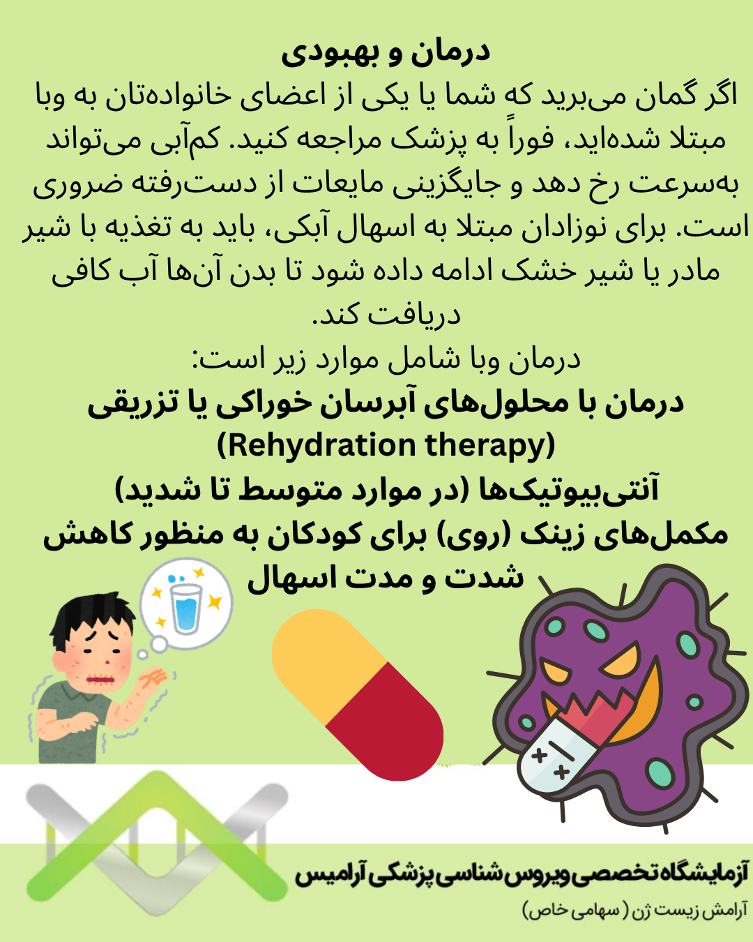 در زمان شیوع وبا، هر فردی که دچار اسهال آبکی حاد (۳ یا بیش از ۳ بار مدفوع شل در روز) شود، باید فوراً به مراکز درمانی مراجعه کند.