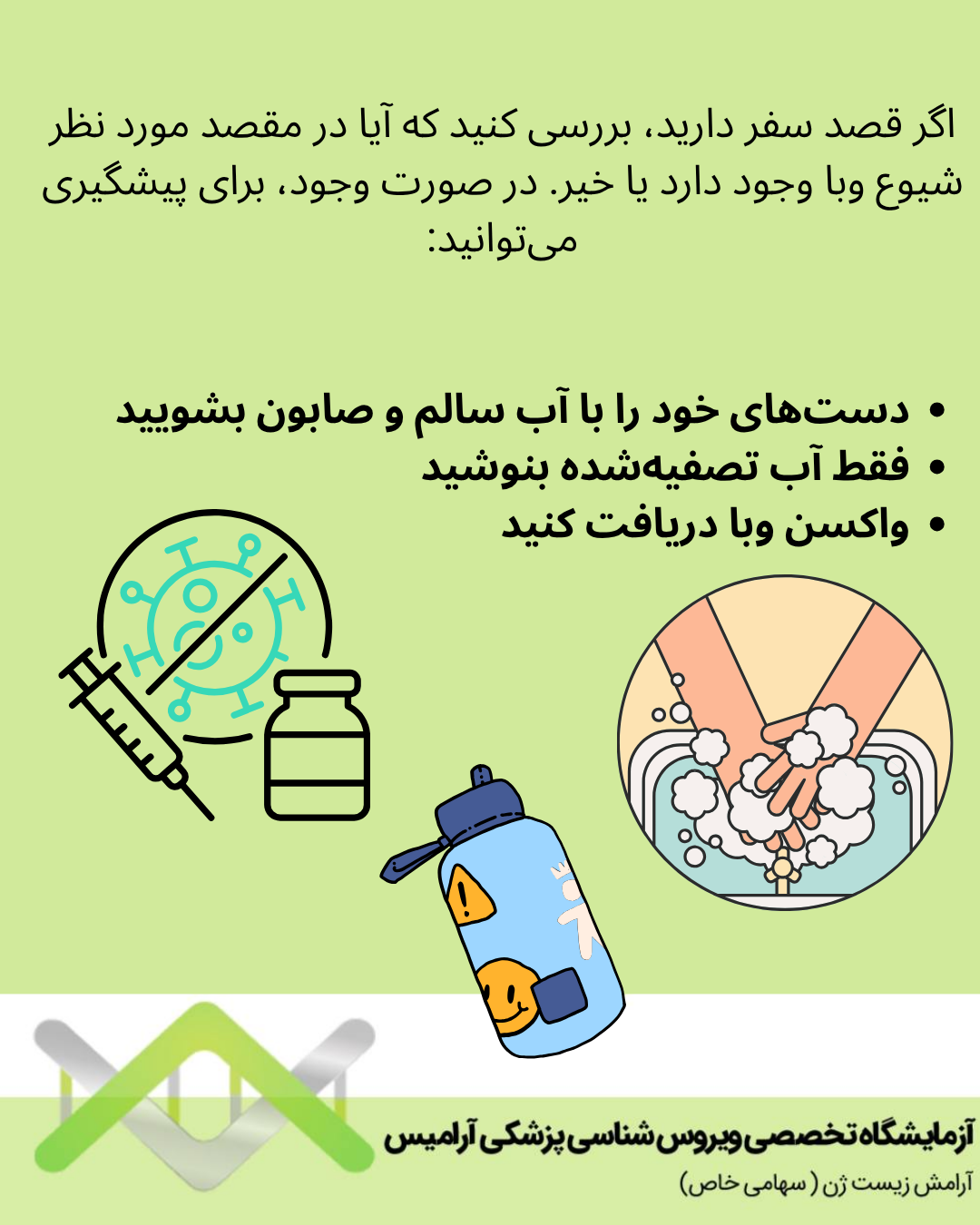 اگر قصد سفر دارید، بررسی کنید که آیا در مقصد مورد نظر شیوع وبا وجود دارد یا خیر. در صورت وجود، برای پیشگیری میتوانید:
