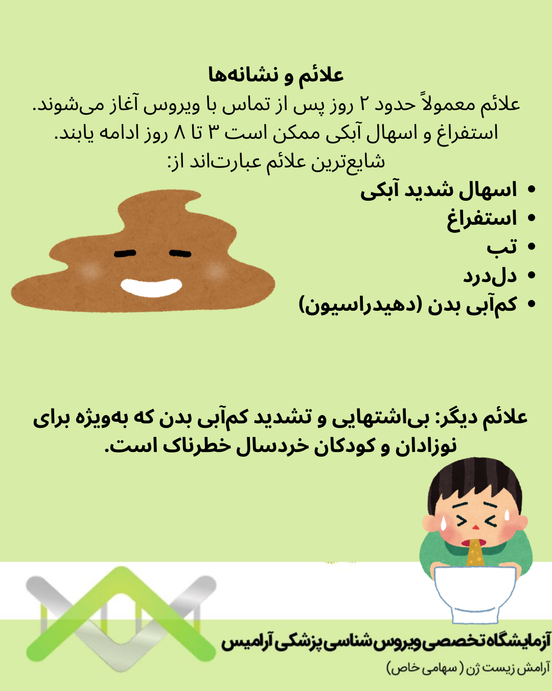 استفراغ و اسهال آبکی ممکن است ۳ تا ۸ روز ادامه یابند.