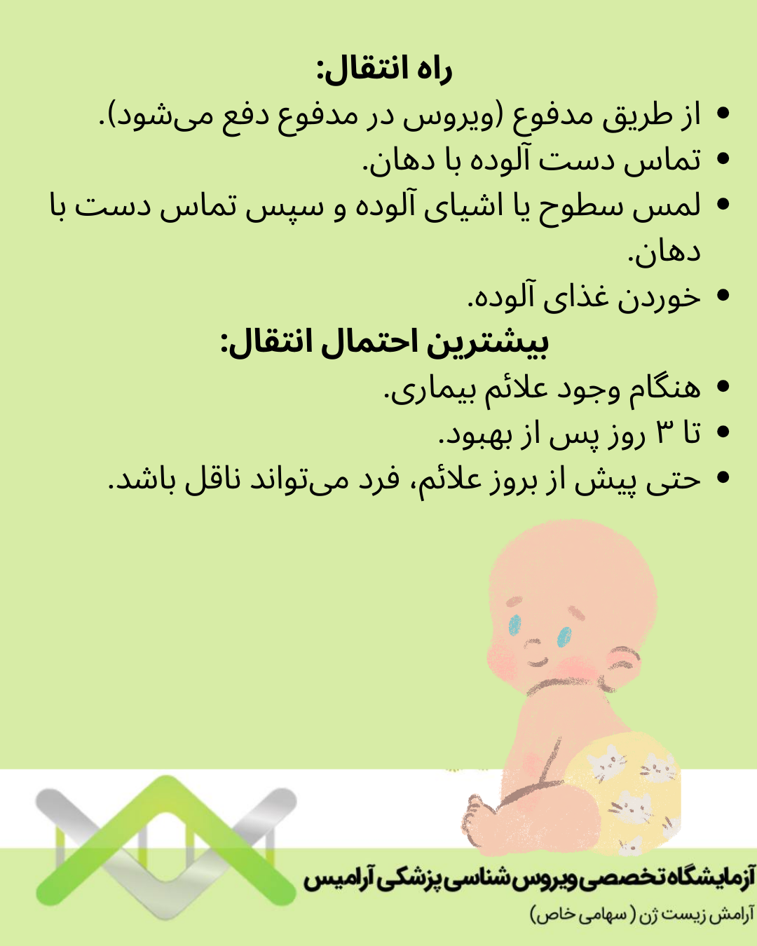 • از طریق مدفوع (ویروس در مدفوع دفع میشود.)