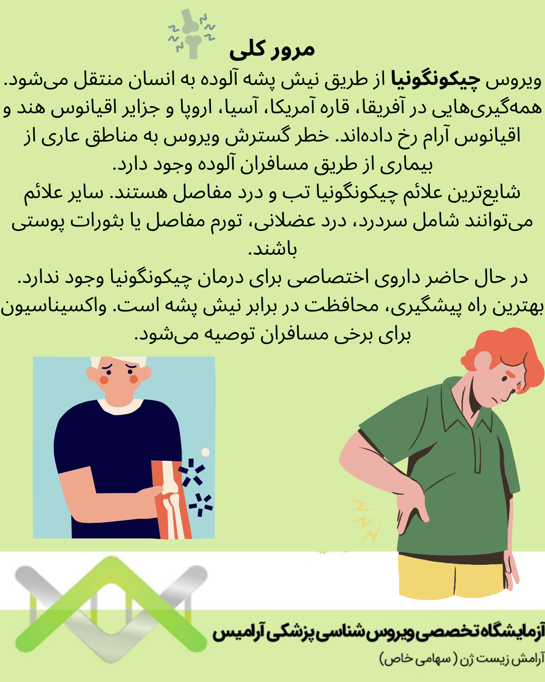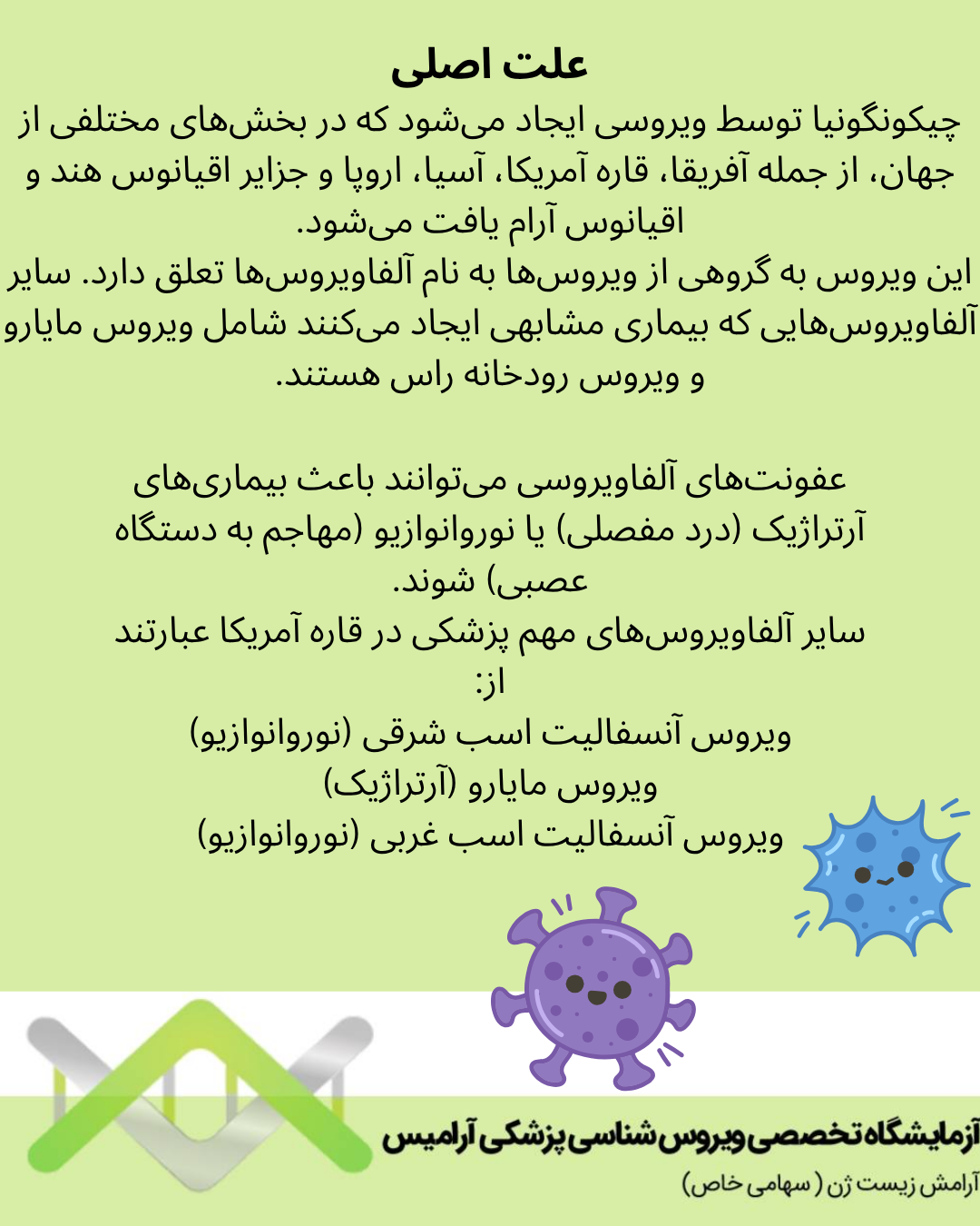 چیکونگونیا توسط ویروسی ایجاد میشود که در بخشهای مختلفی از جهان، از جمله آفریقا، قاره آمریکا، آسیا، اروپا و جزایر اقیانوس هند و اقیانوس آرام یافت میشود.