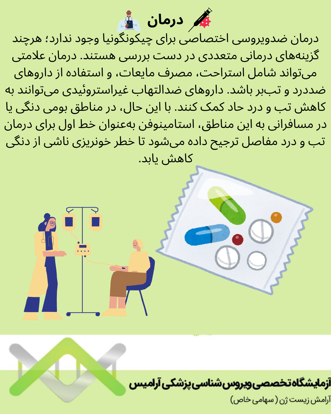 در حال حاضر داروی اختصاصی برای درمان چیکونگونیا وجود ندارد. بهترین راه پیشگیری، محافظت در برابر نیش پشه است. واکسیناسیون برای برخی مسافران توصیه میشود.