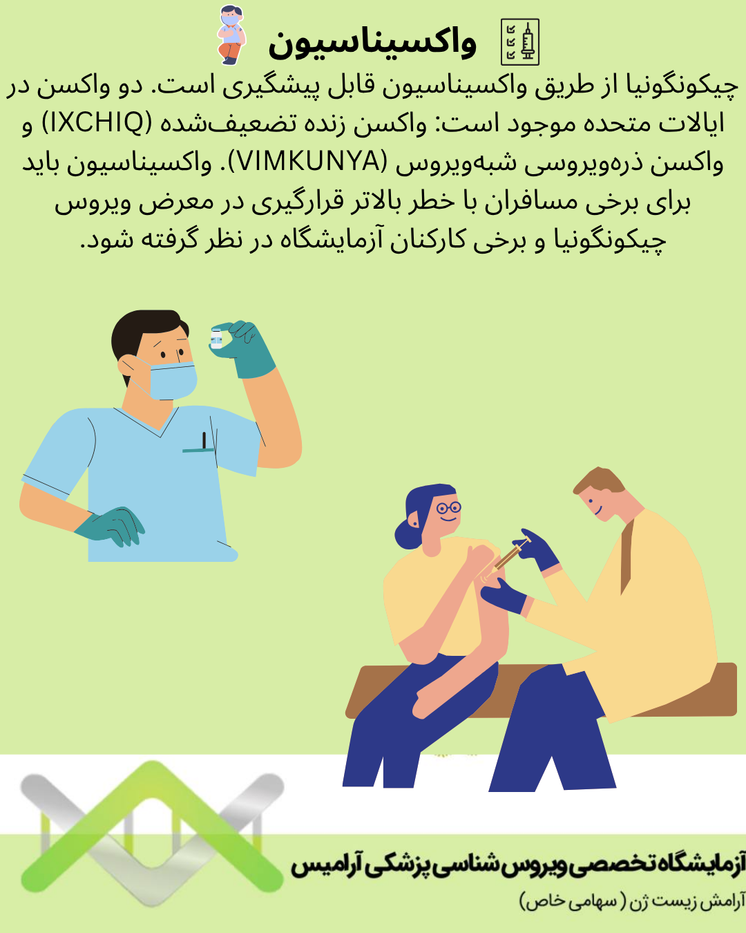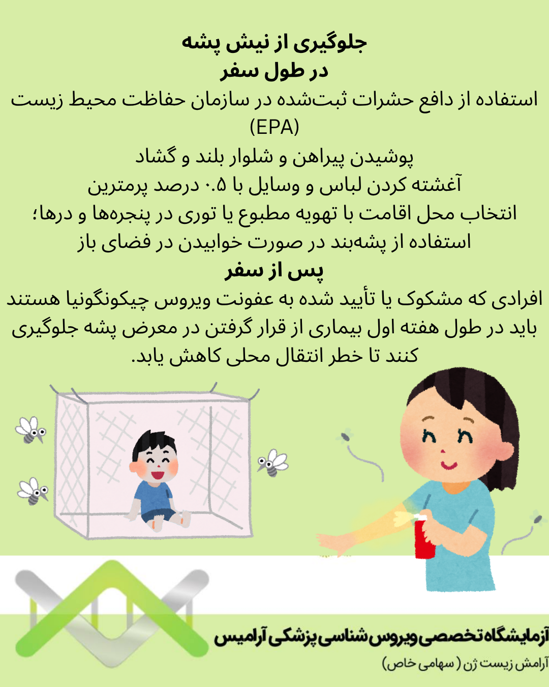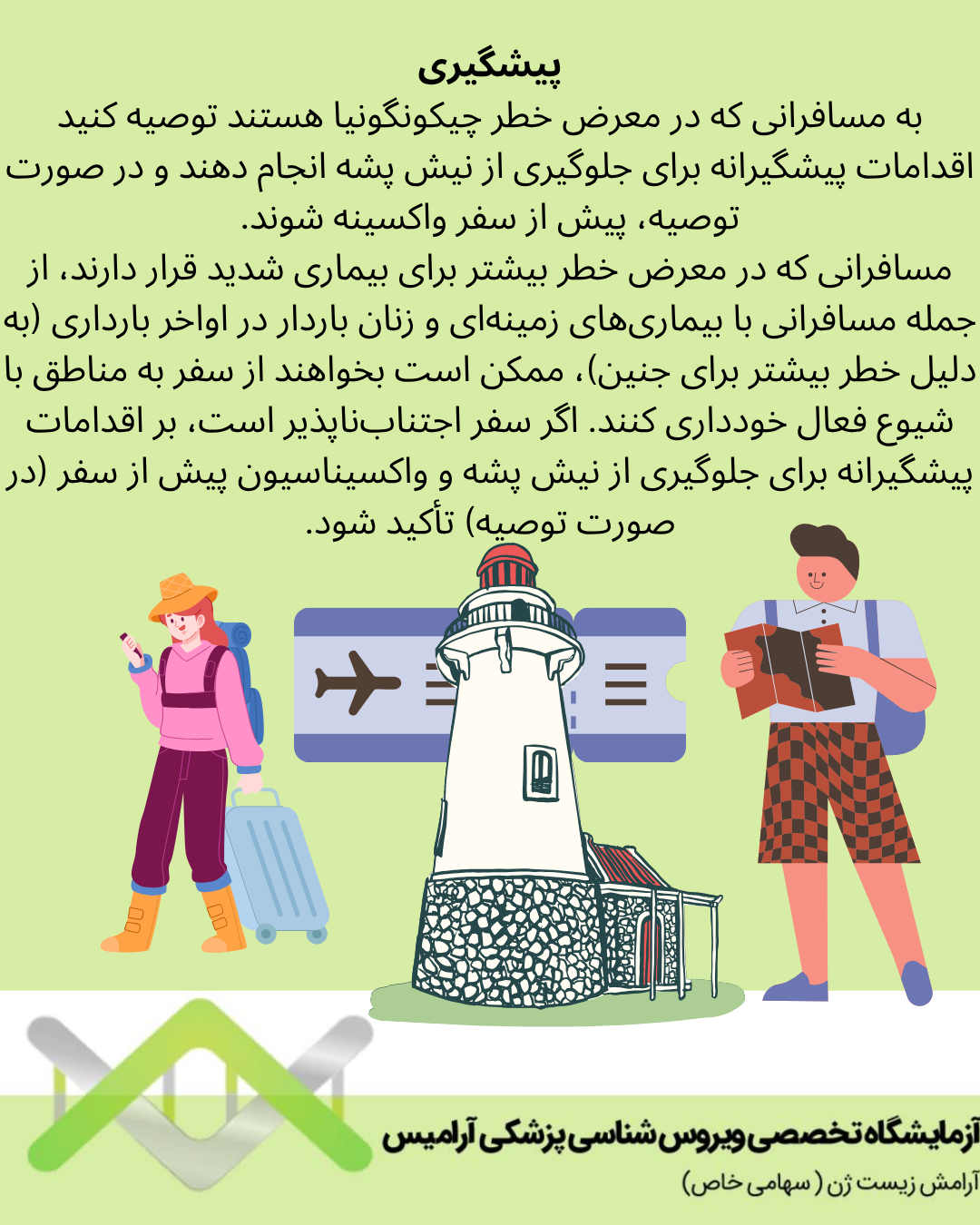 به مسافرانی که در معرض خطر چیکونگونیا هستند توصیه کنید اقدامات پیشگیرانه برای جلوگیری از نیش پشه انجام دهند و در صورت توصیه، پیش از سفر واکسینه شوند.