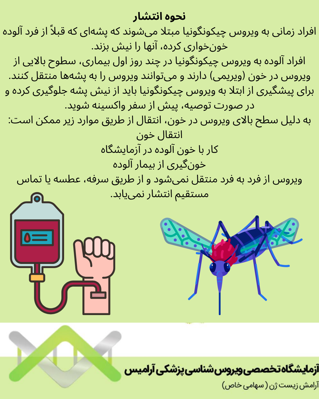افراد زمانی به ویروس چیکونگونیا مبتلا میشوند که پشهای که قبلاً از فرد آلوده خونخواری کرده، آنها را نیش بزند.