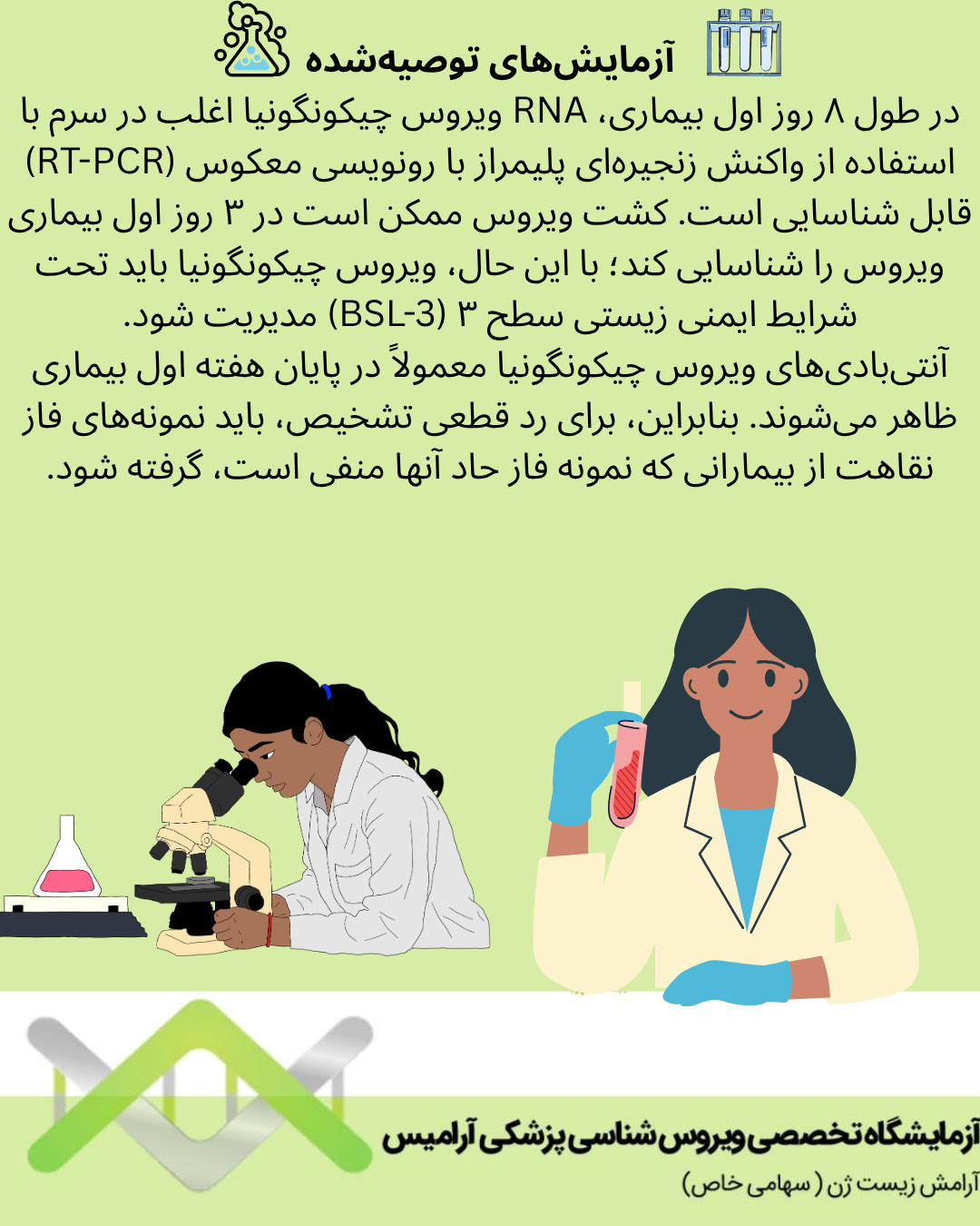 آنتیبادیهای ویروس چیکونگونیا معمولاً در پایان هفته اول بیماری ظاهر میشوند. بنابراین، برای رد قطعی تشخیص، باید نمونههای فاز نقاهت از بیمارانی که نمونه فاز حاد آنها منفی است، گرفته شود.