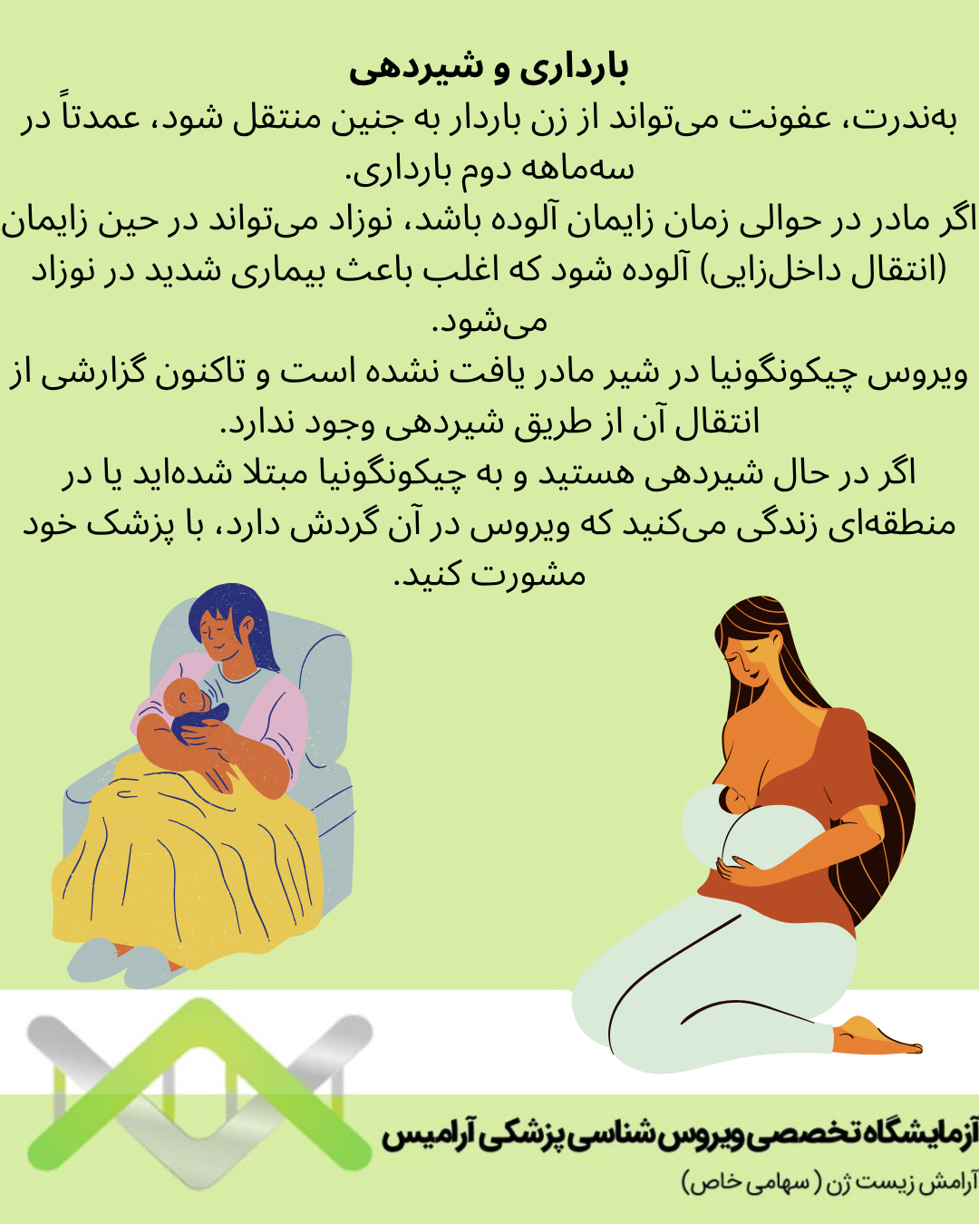 ویروس چیکونگونیا در شیر مادر یافت نشده است و تاکنون گزارشی از انتقال آن از طریق شیردهی وجود ندارد.