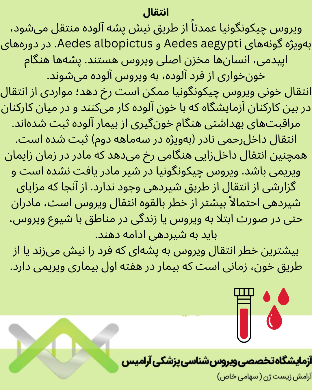 افراد آلوده به ویروس چیکونگونیا در چند روز اول بیماری، سطوح بالایی از ویروس در خون (ویریمی) دارند و میتوانند ویروس را به پشهها منتقل کنند.