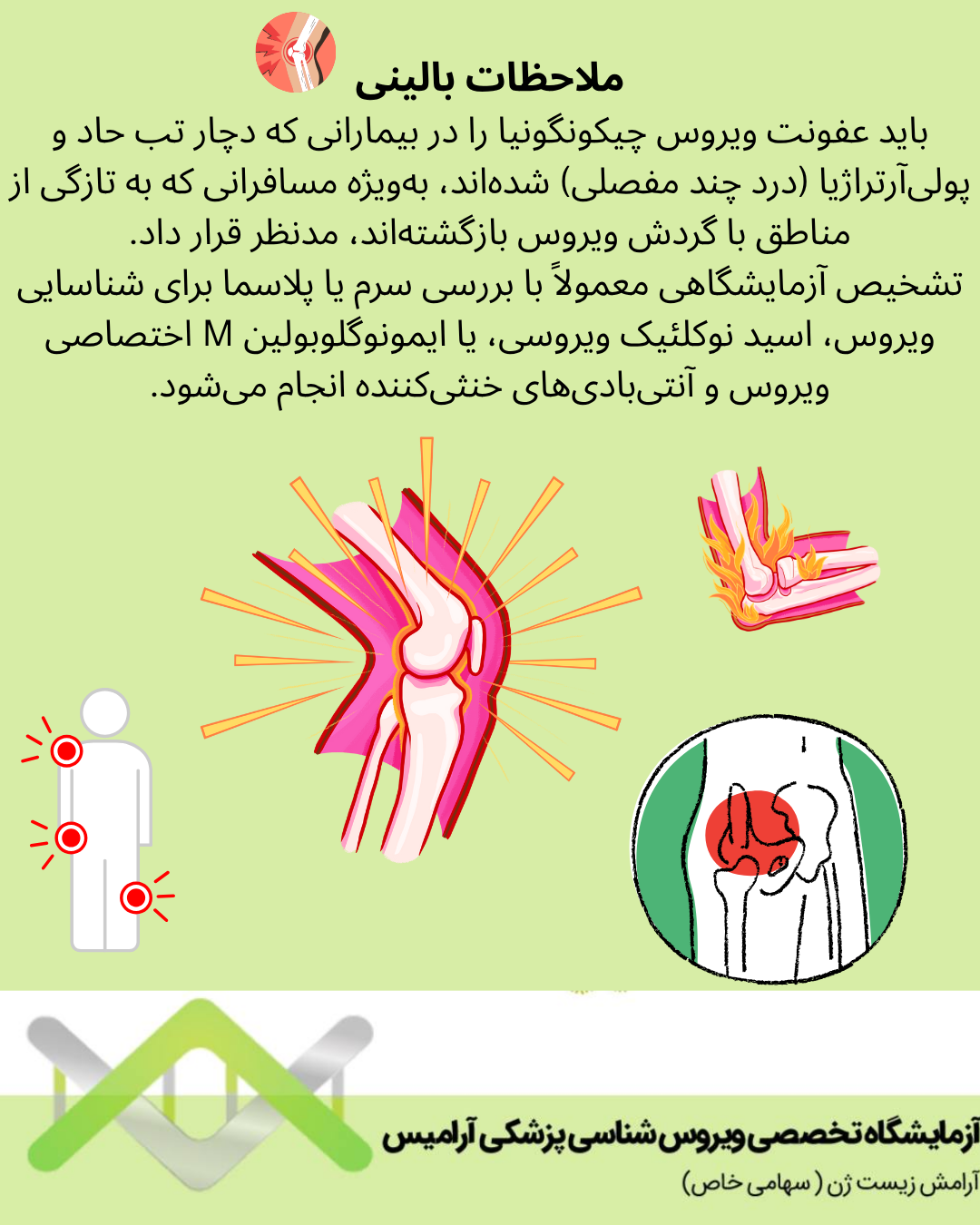 باید عفونت ویروس چیکونگونیا را در بیمارانی که دچار تب حاد و پولیآرتراژیا (درد چند مفصلی) شدهاند، بهویژه مسافرانی که به تازگی از مناطق با گردش ویروس بازگشتهاند، مدنظر قرار داد.