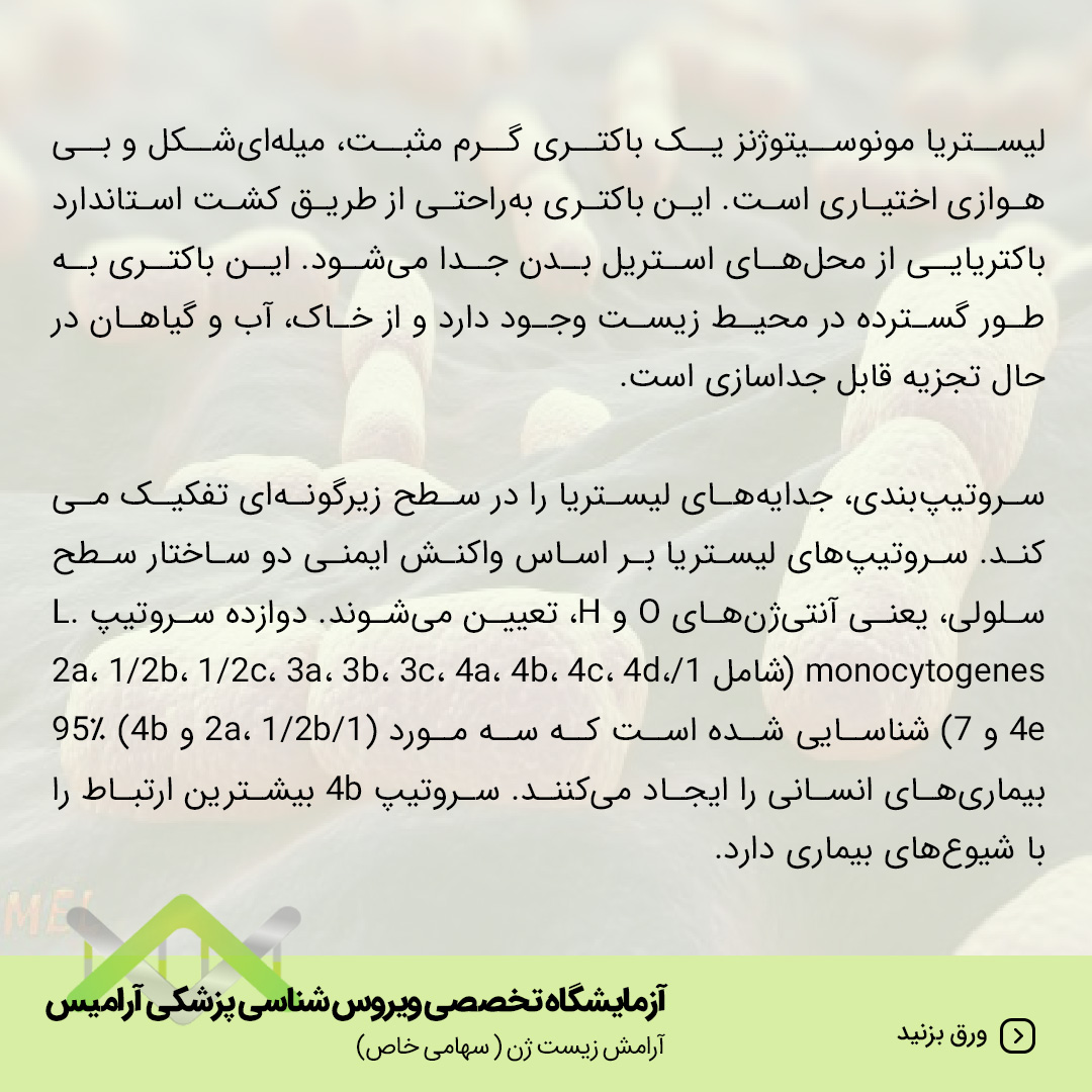 لیستریا مونوسیتوژنز یک باکتری گرم مثبت میله ای شکل و بی هوازی اختیاری است. این باکتری به راحتی از طریق کشت استاندارد باکتریایی از محل های استریل بدن جدا میشود. این باکتری به طور گسترده در محیط زیست وجود دارد و از خاک، آب و گیاهان در حال تجزیه قابل جداسازی است.