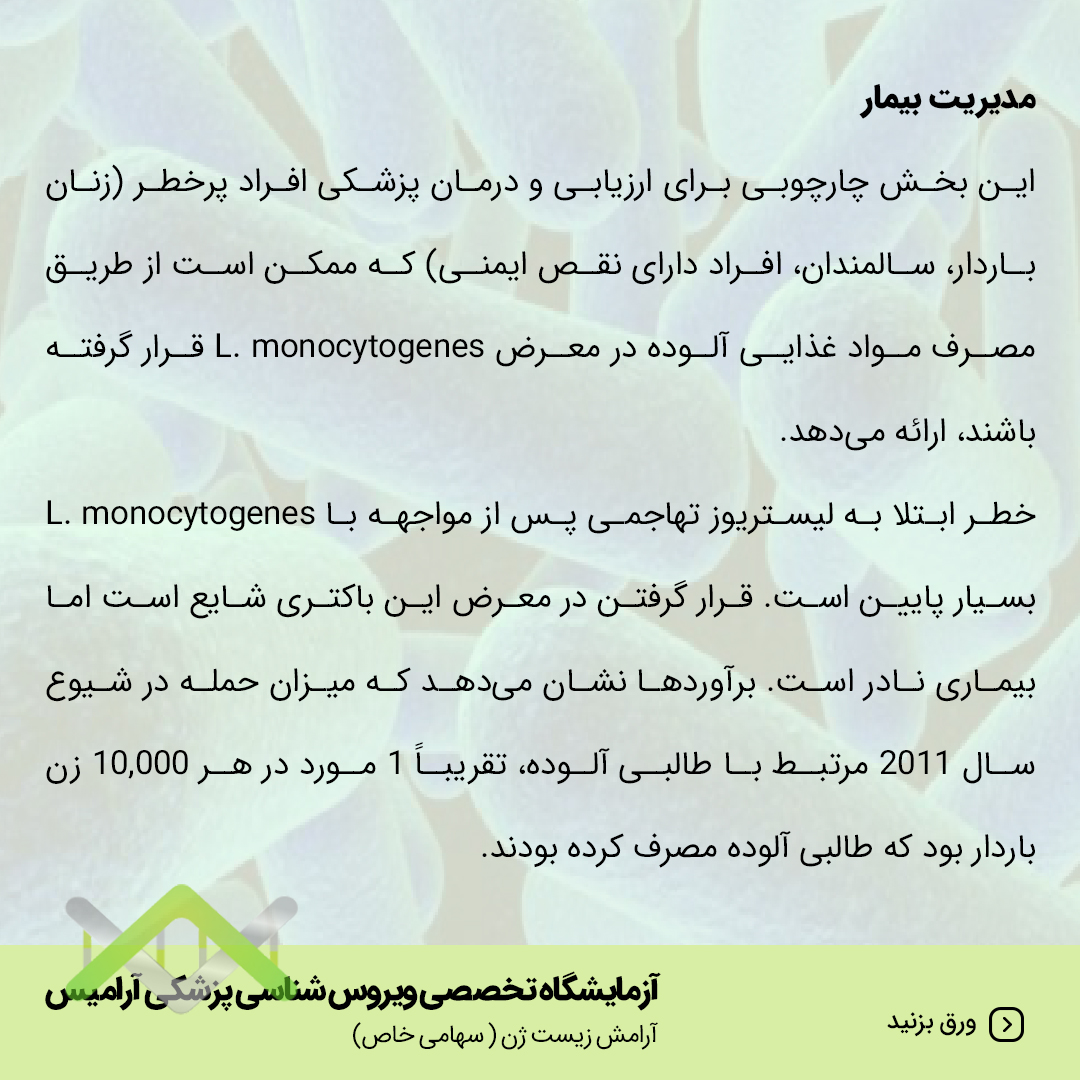 این بخش چارچوبی برای ارزیابی و درمان پزشکی افراد پرخطر، زنان باردار، سالمندان، افراد دارای نقص ایمنی که ممکن است از طریق مصرف مواد غذایی آلوده در معرض L. monocytogenes قرار گرفته باشند ارائه میدهد.