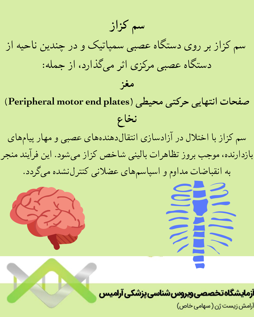 سم کزاز با اختلال در آزادسازی انتقالدهندههای عصبی و مهار پیامهای بازدارنده، موجب بروز تظاهرات بالینی شاخص کزاز میشود. این فرآیند منجر به انقباضات مداوم و اسپاسمهای عضلانی کنترلنشده میگردد.