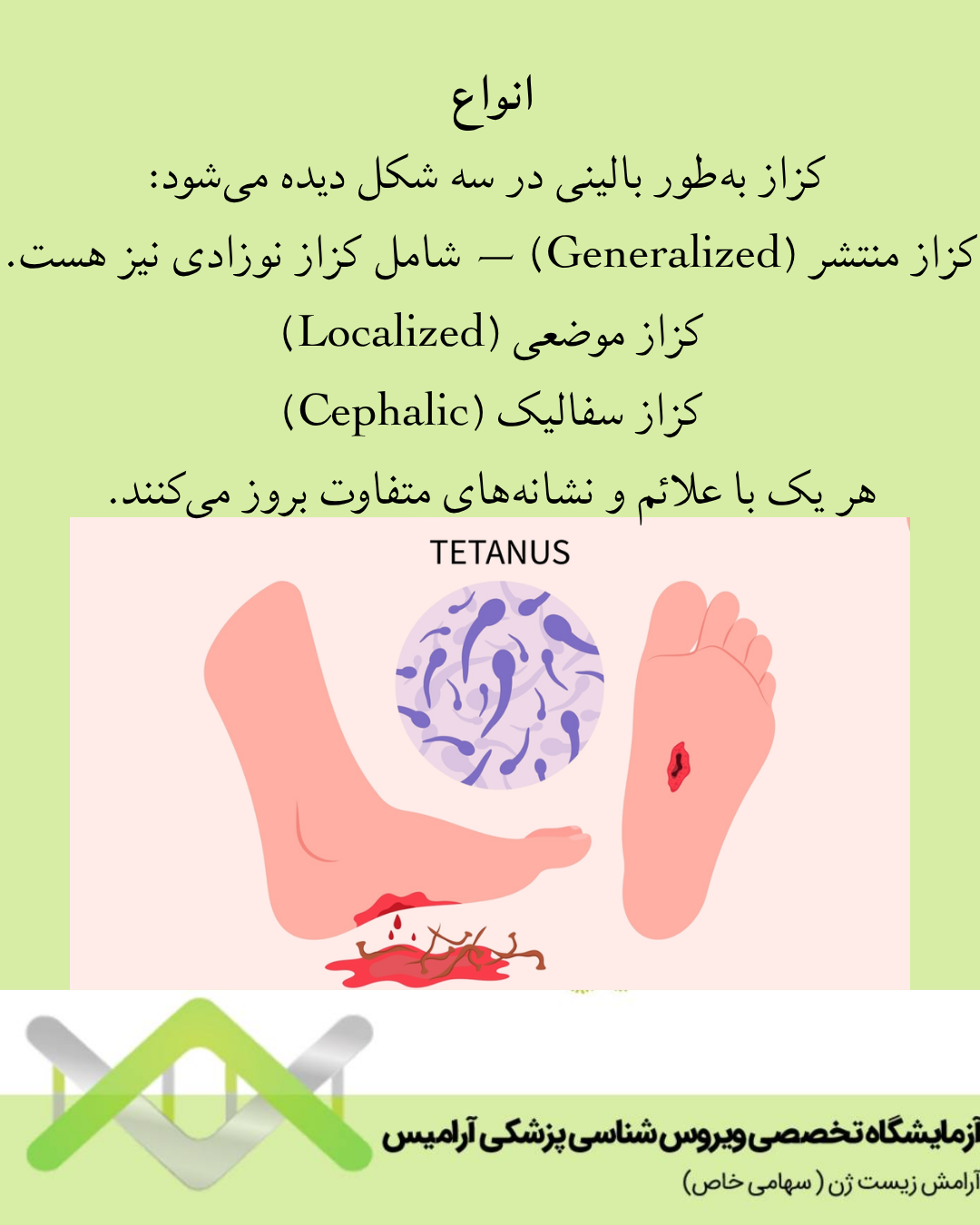 • کزاز منتشر (Generalized) — شامل کزاز نوزادی نیز هست.