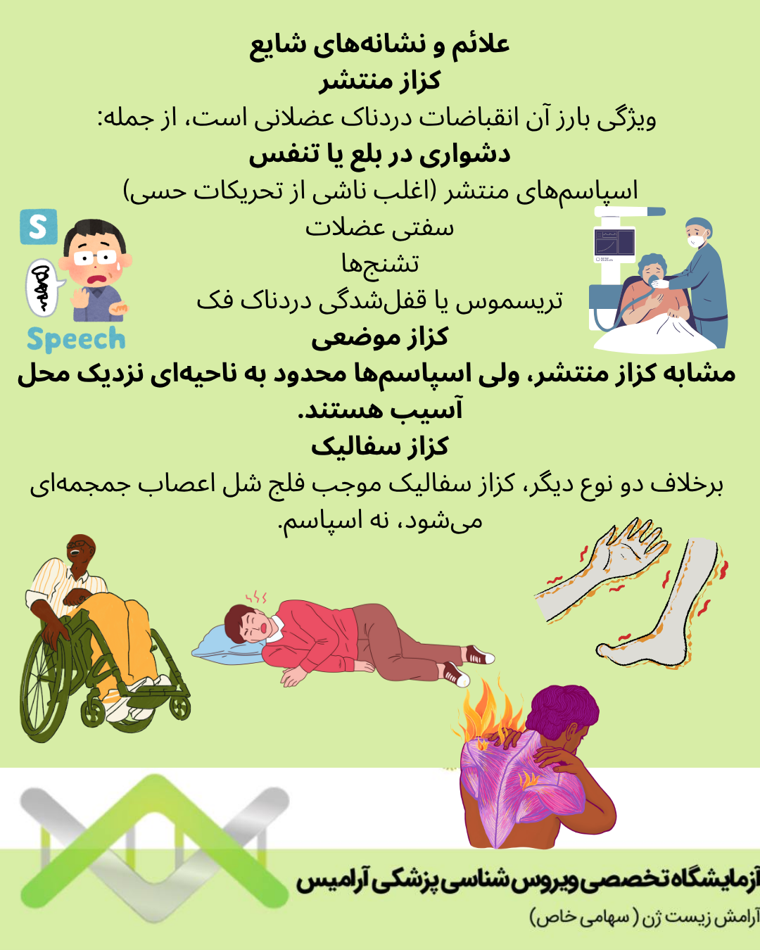 کزاز منتشر میتواند همراه با اختلالات عصبی و طیفی از عوارض ناشی از اسپاسمهای شدید و بستری طولانیمدت باشد.