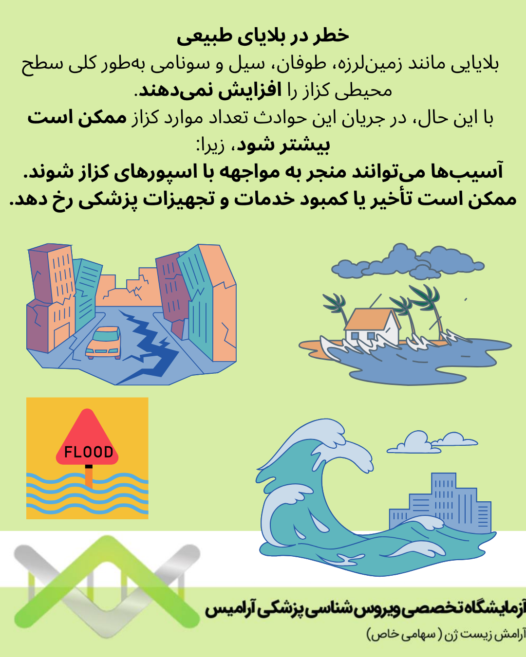بلایایی مانند زمینلرزه، طوفان، سیل و سونامی بهطور کلی سطح محیطی کزاز را افزایش نمیدهند.