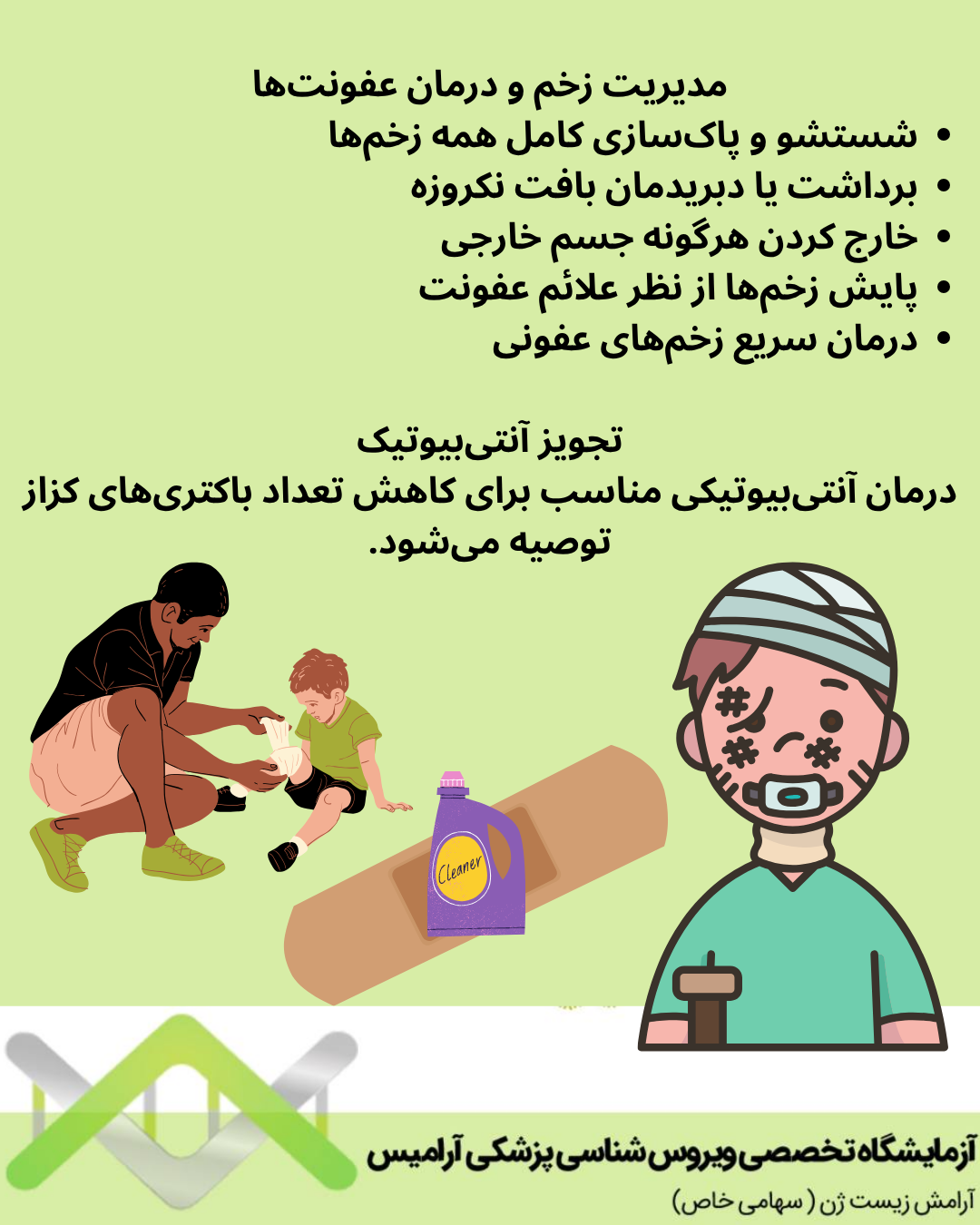 درمان آنتیبیوتیکی مناسب برای کاهش تعداد باکتریهای کزاز توصیه میشود.